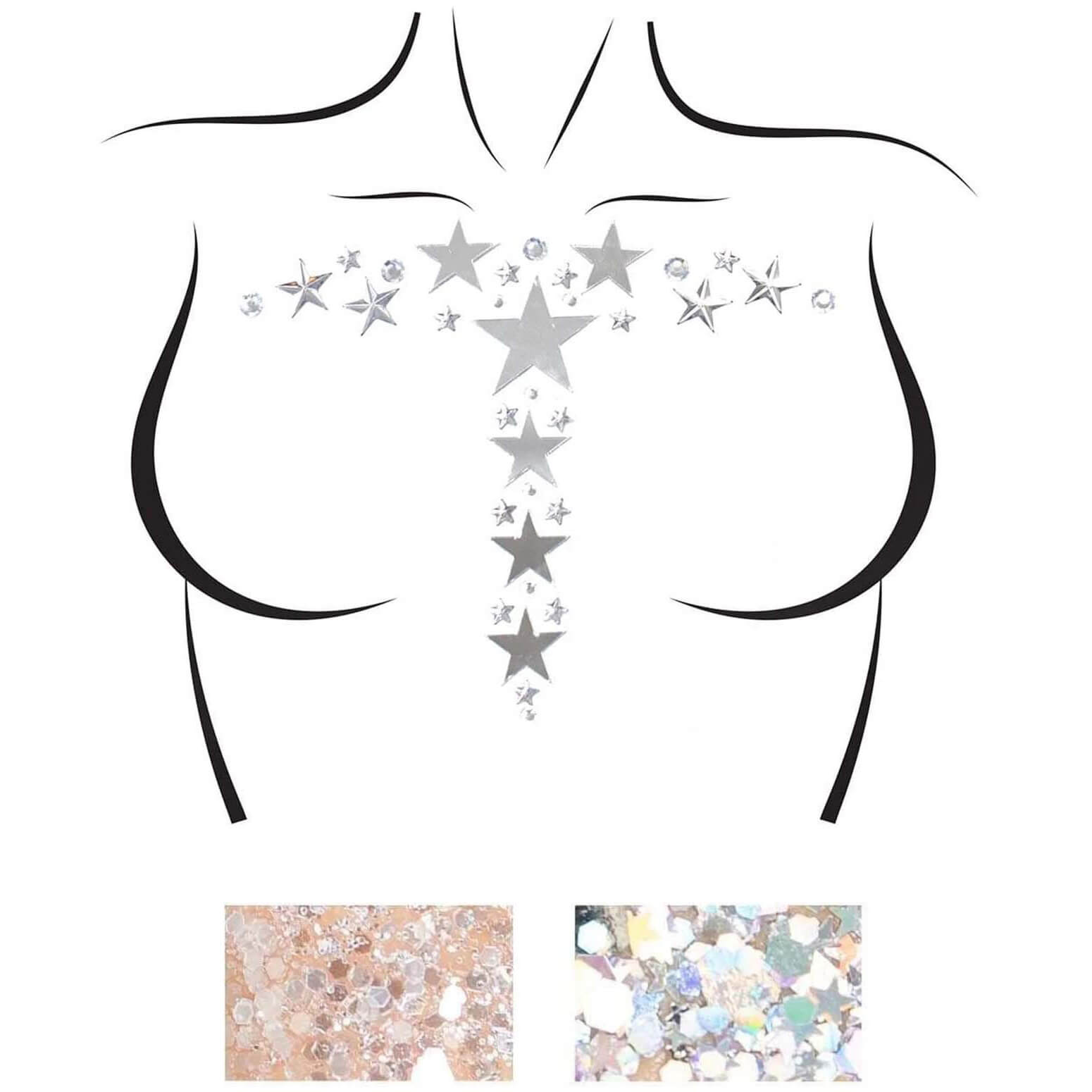 80er Jahre/Sterne Schmucksteine Dekollete Set KISMET auf Folie selbstklebend silber – (ARTIKEL/REFERNZ: 714718549866/LABODY013 – Kategorie/Suche: – Hersteller: Leg Avenue Europe)
