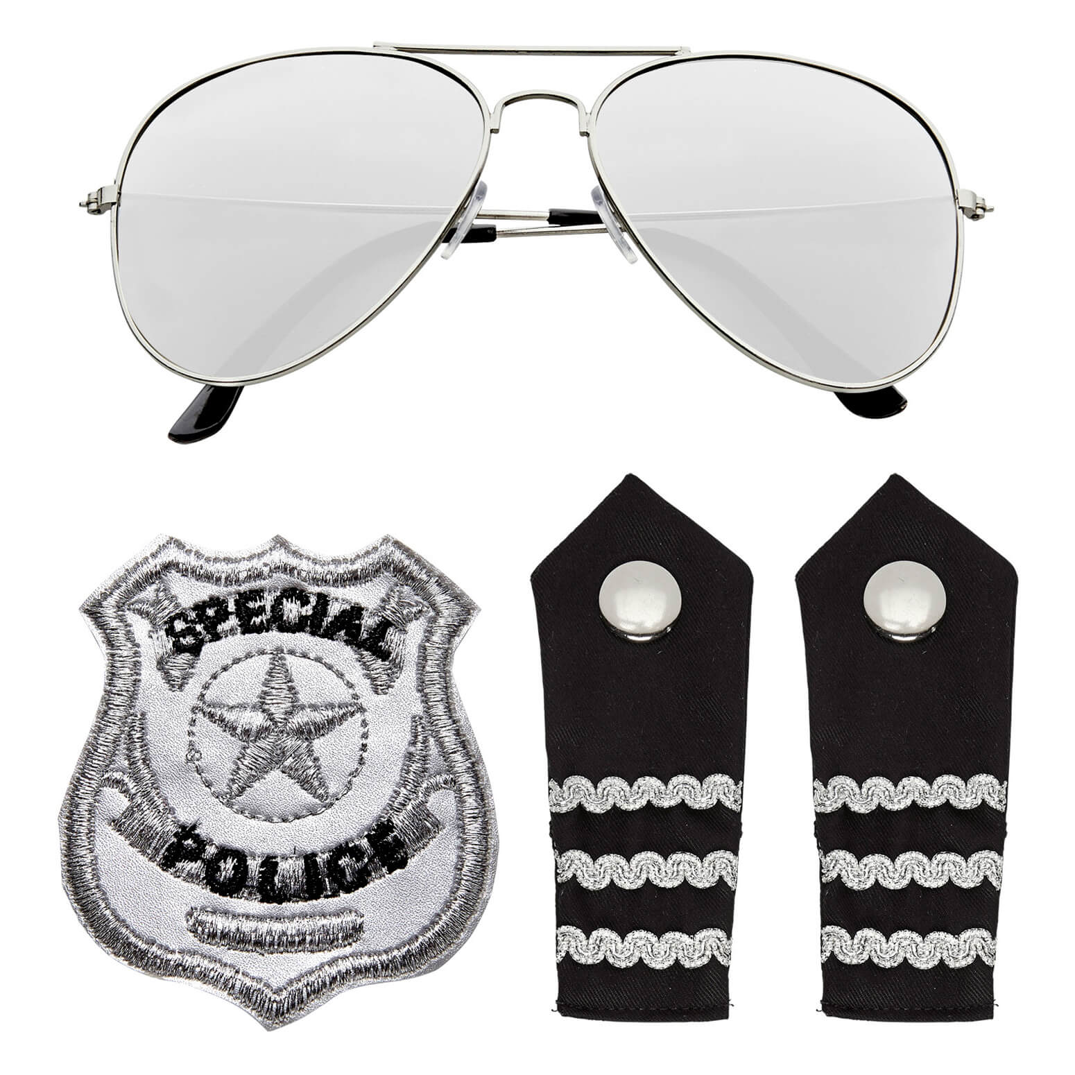 Polizei Abzeichen+Brille Set Epauletten+Brosche Polizeimarke+Sonnenbrille Special Police silber-schwarz – (ARTIKEL/REFERNZ: 8003558000845/WI00084 – Kategorie/Suche: Polizistin Polizei Police – Hersteller: Widmann S.r.l.)