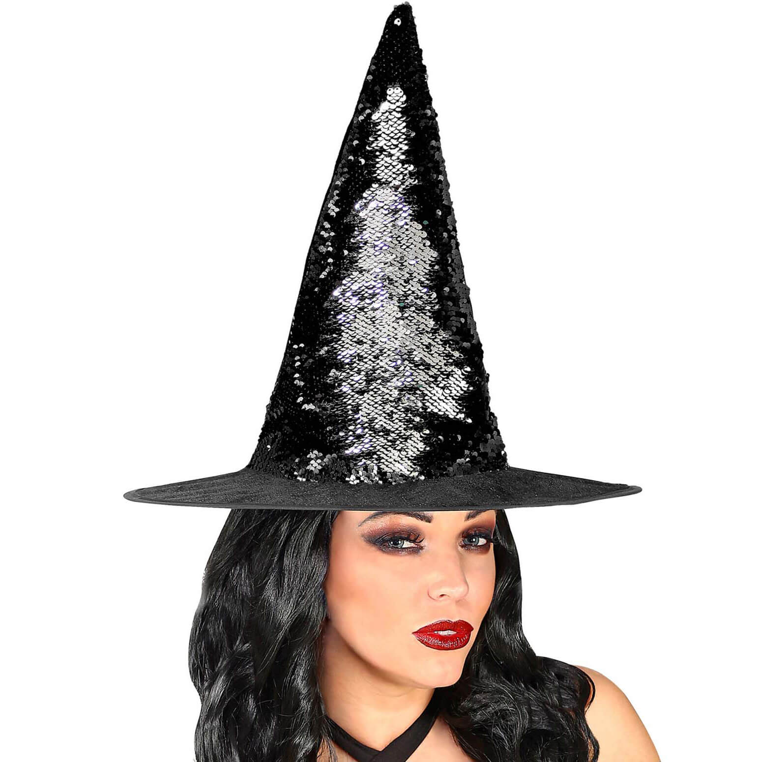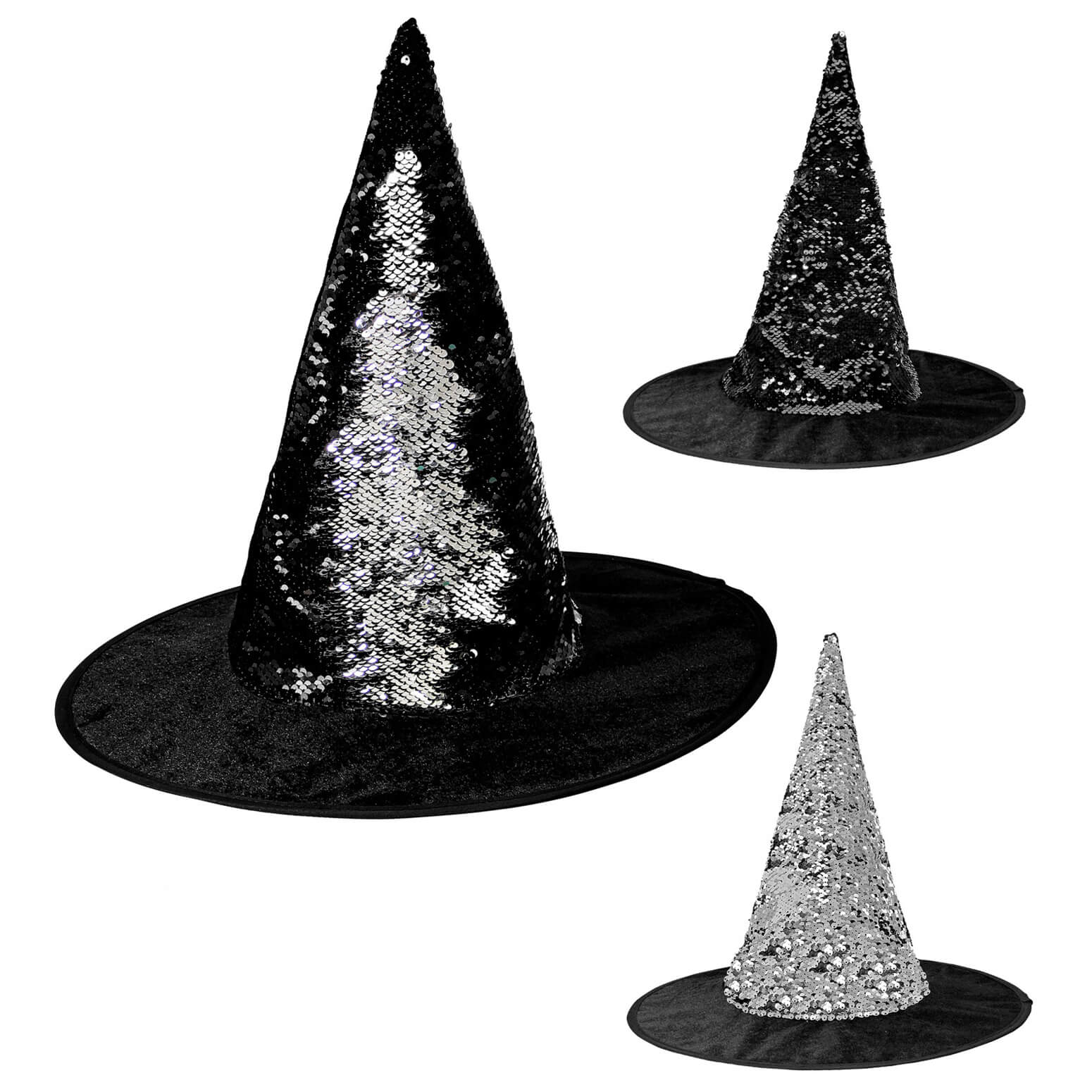Hexen Zauberer Hexenhut aus Samt mit Wendepailletten schwarz-silber