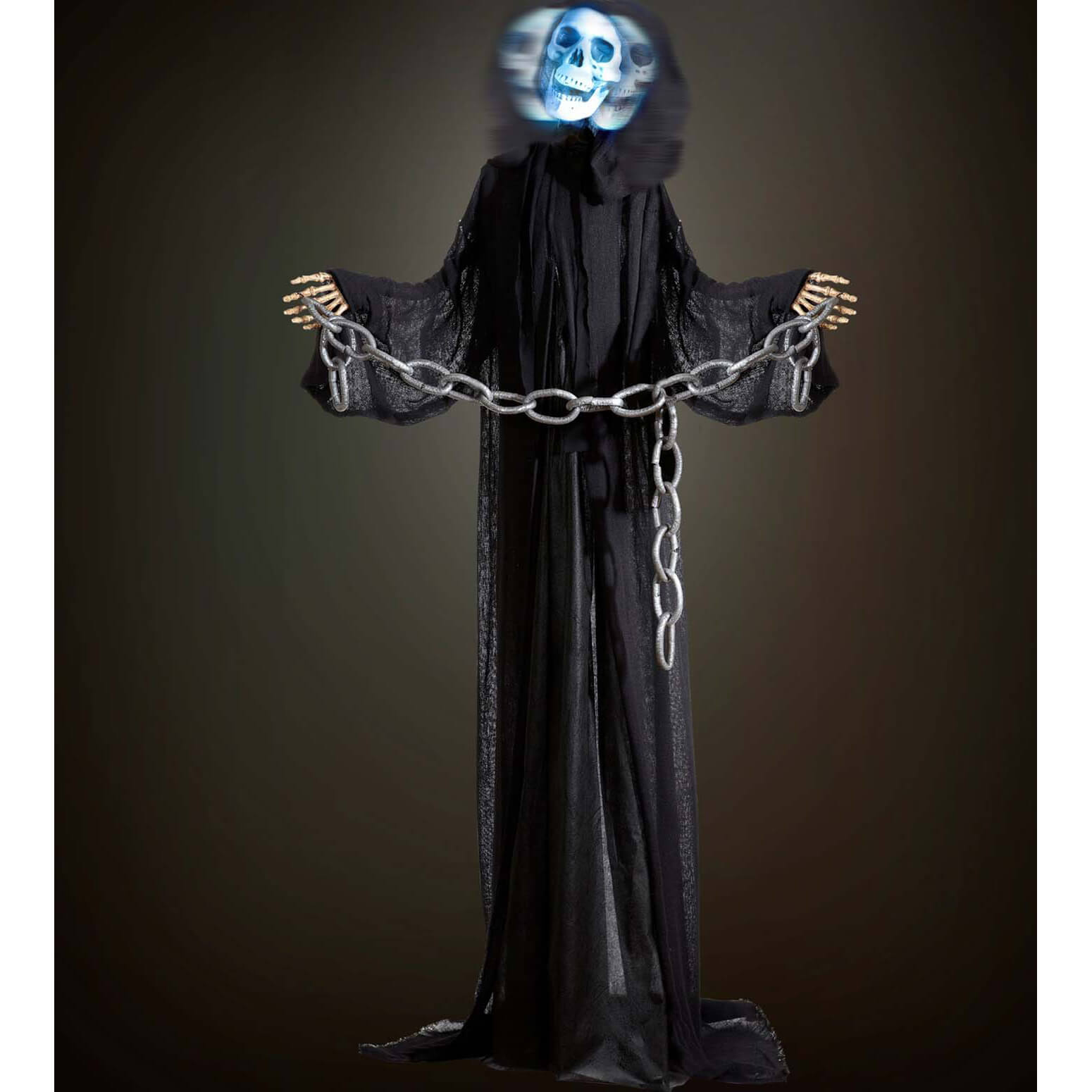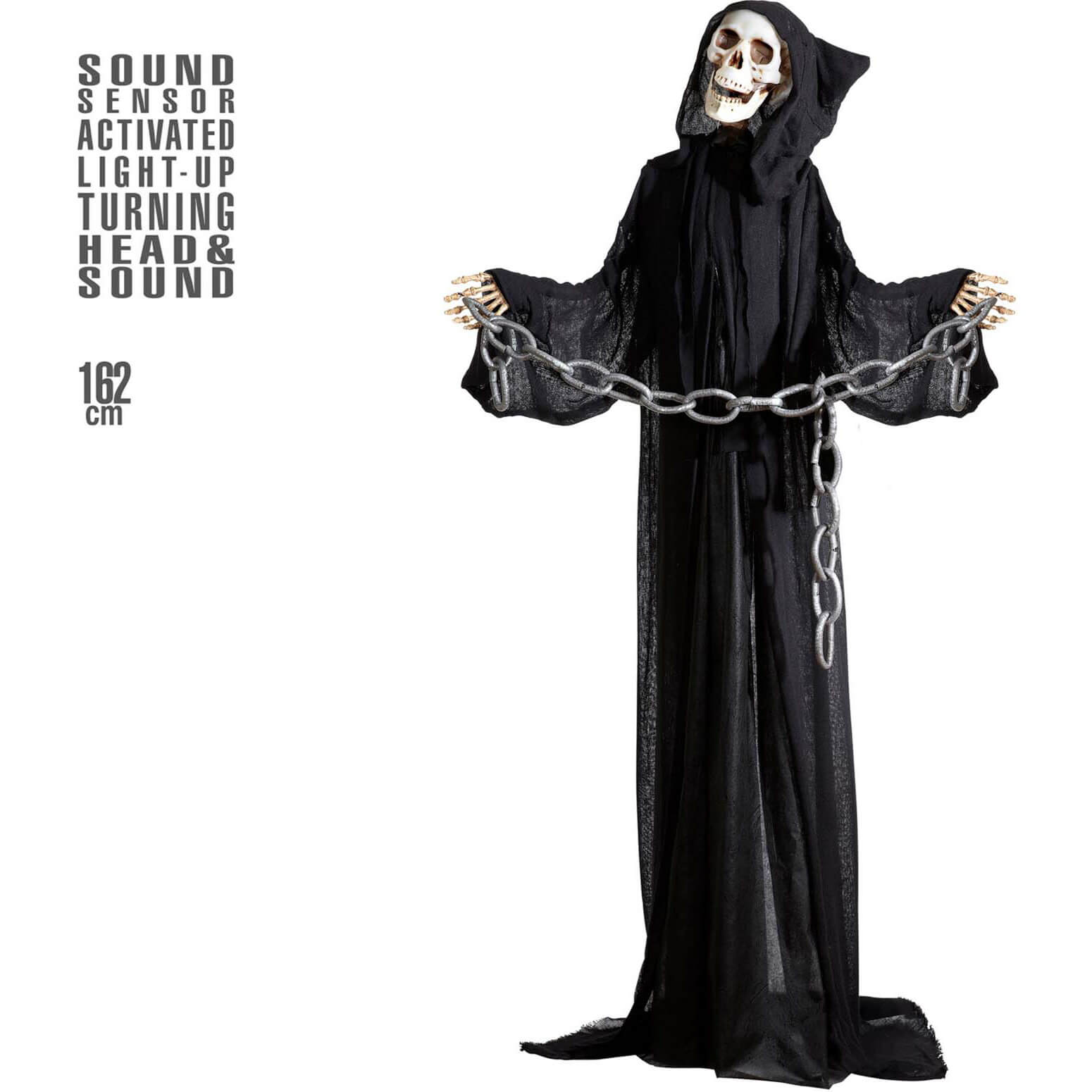 Skelett Tod Deko Hängefigur animiert+LED+Sound mit Kette zwischen den Händen GRIM REAPER 162cm schwarz-weiß