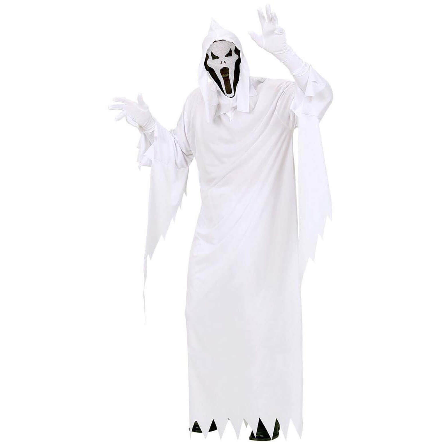 Geist Kostüm Robe Tunika lang Gespenst mit Maske und Kapuze weiß