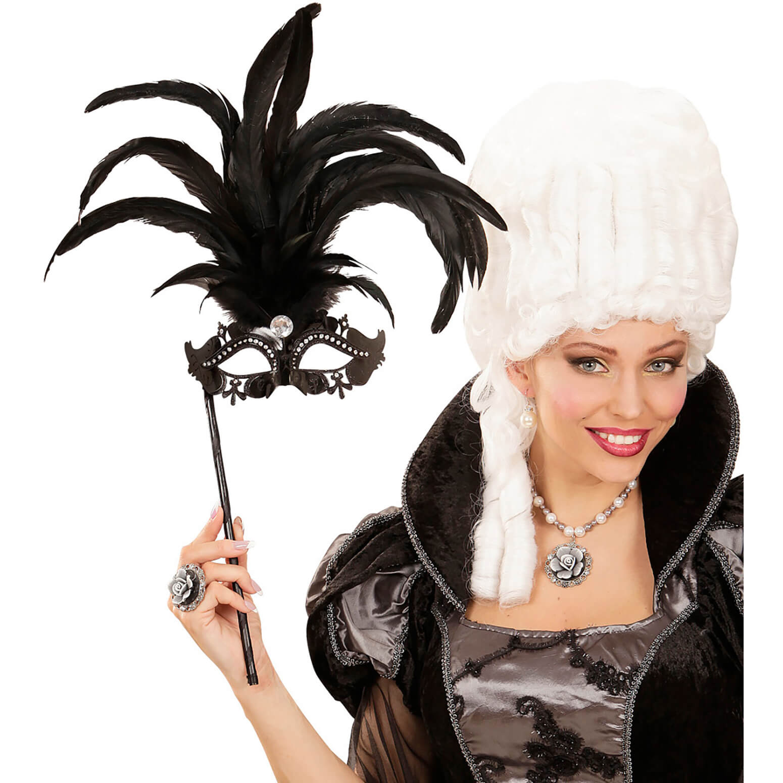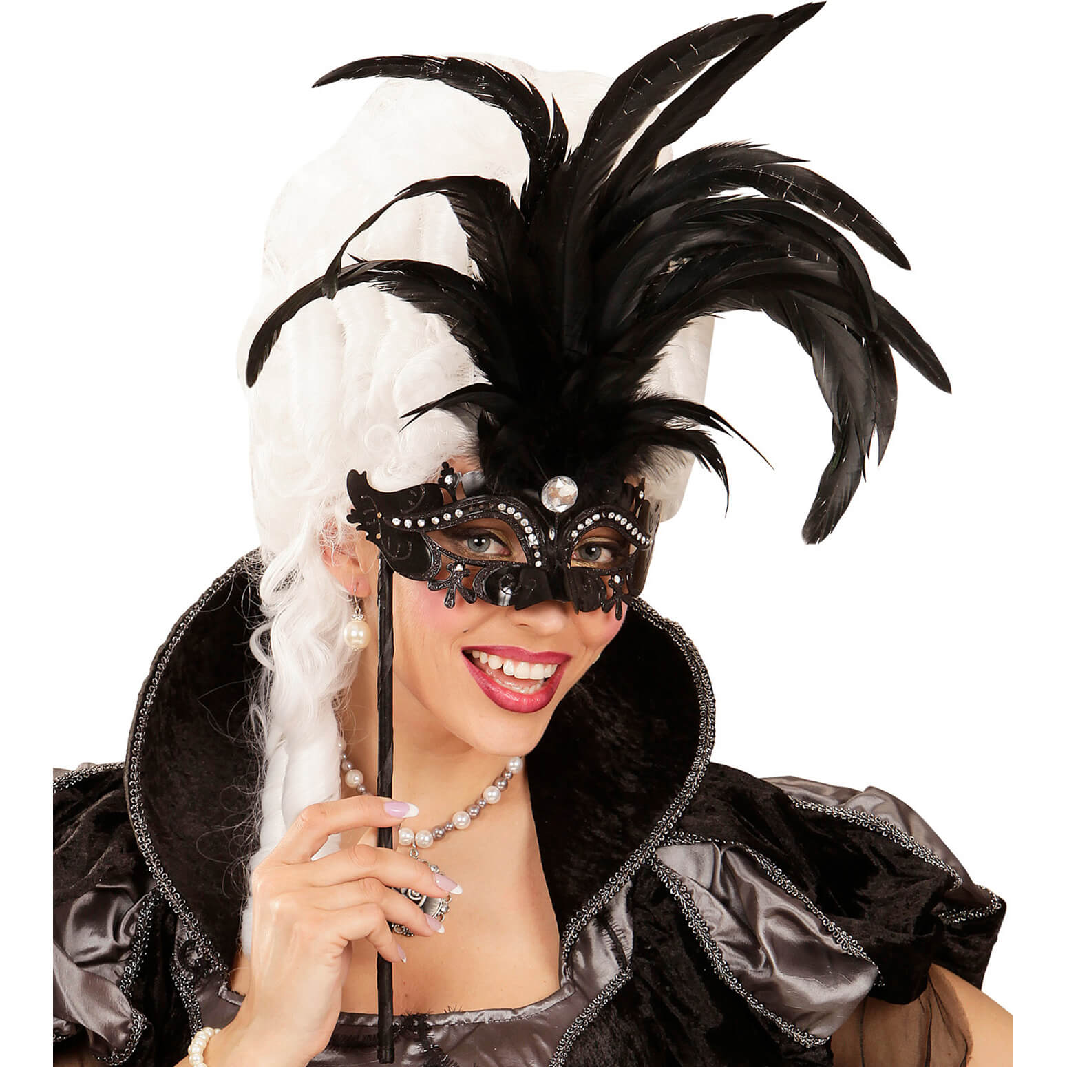 Edle venezianische Dominomaske mit Stab und Federn schwarz – (ARTIKEL/REFERNZ: 8003558047086/WI04708 – Kategorie/Suche: – Hersteller: Widmann S.r.l.)