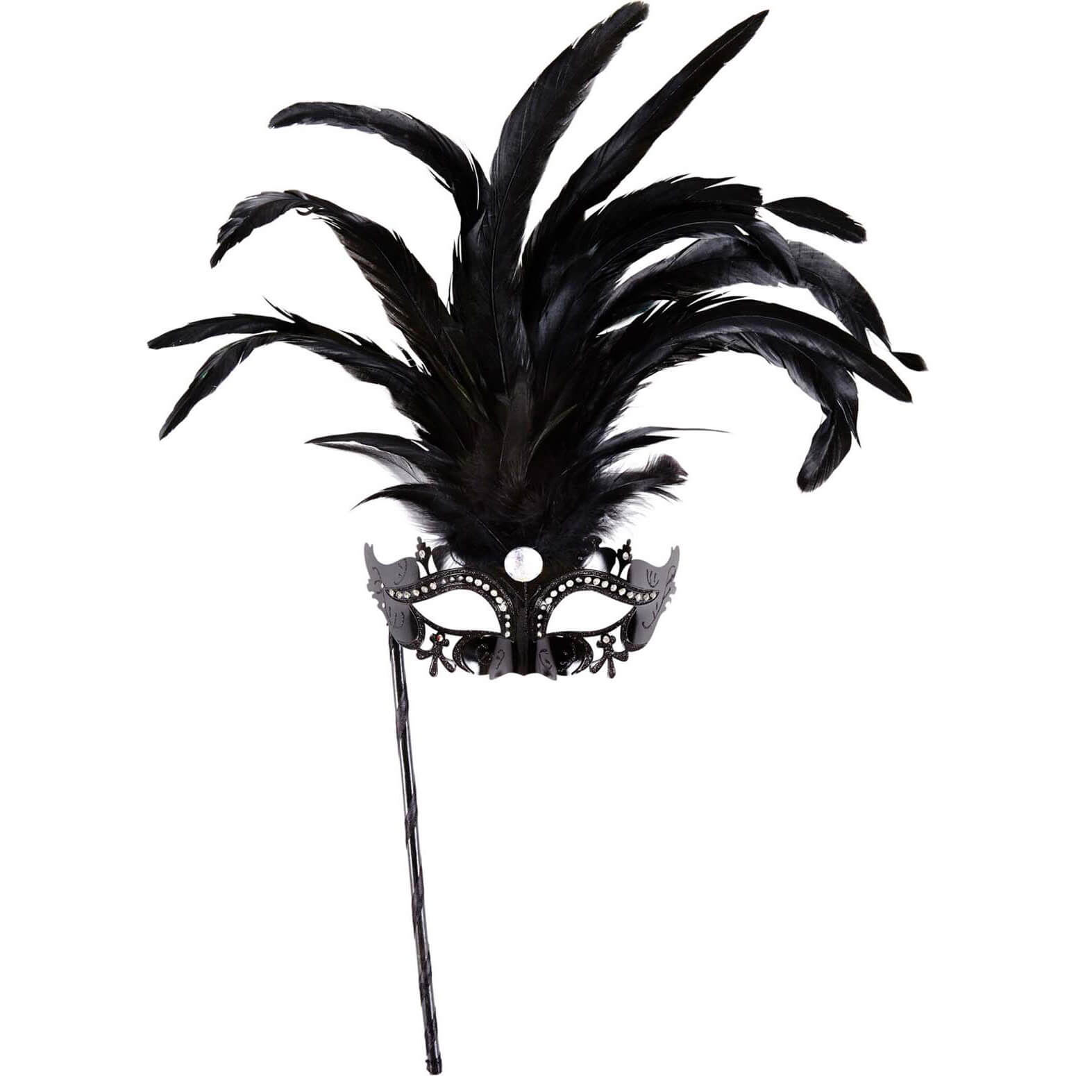Edle venezianische Dominomaske mit Stab und Federn schwarz