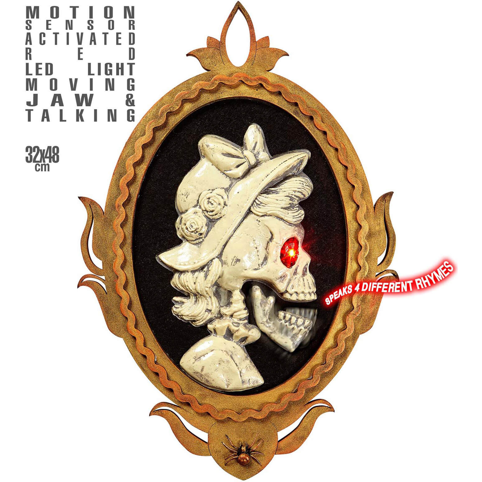 Skelettdame bleich Deko Wandbild animiert+LED+Sound Schädel Lady mit blinke Augen und lachendem Kiefer 32x48cm beige