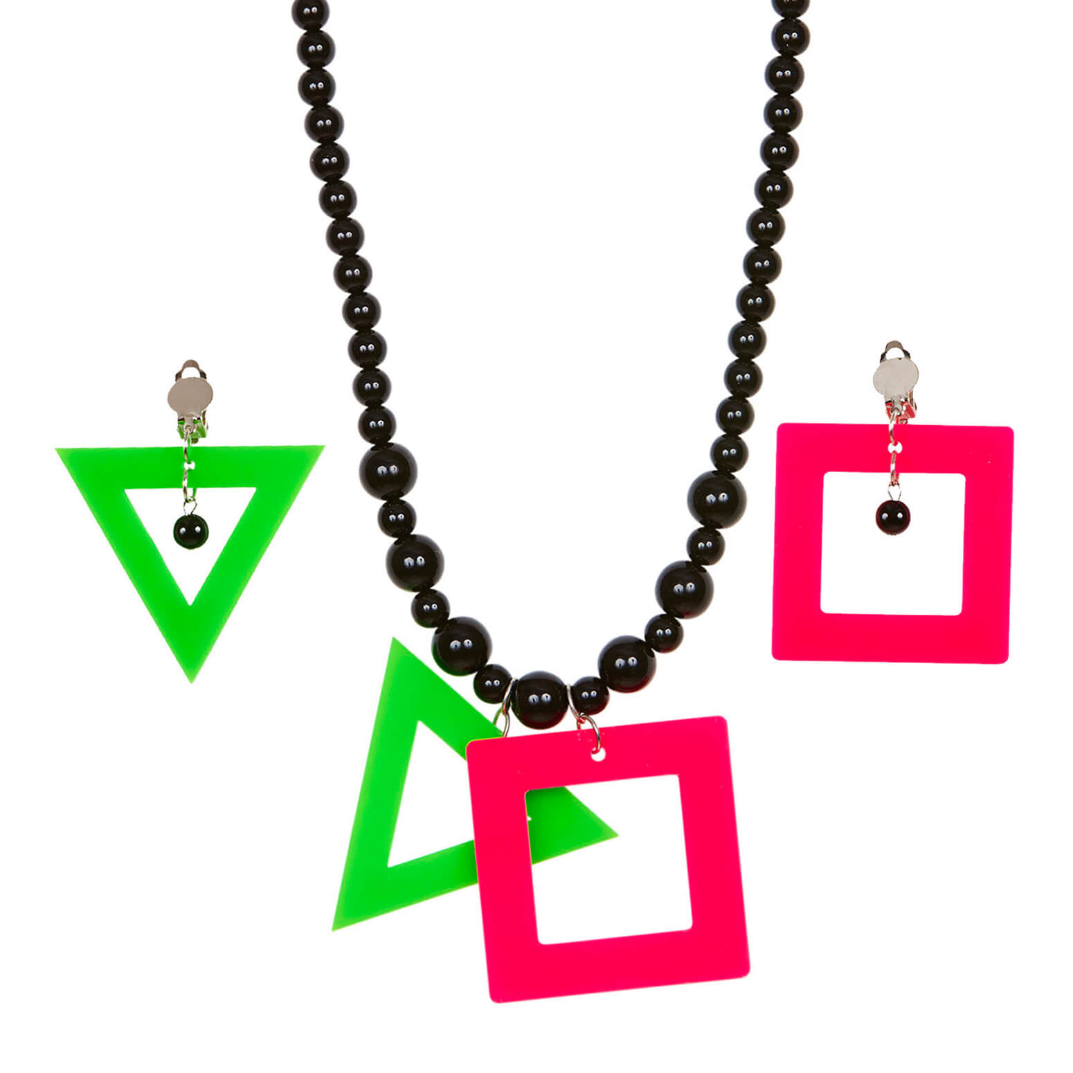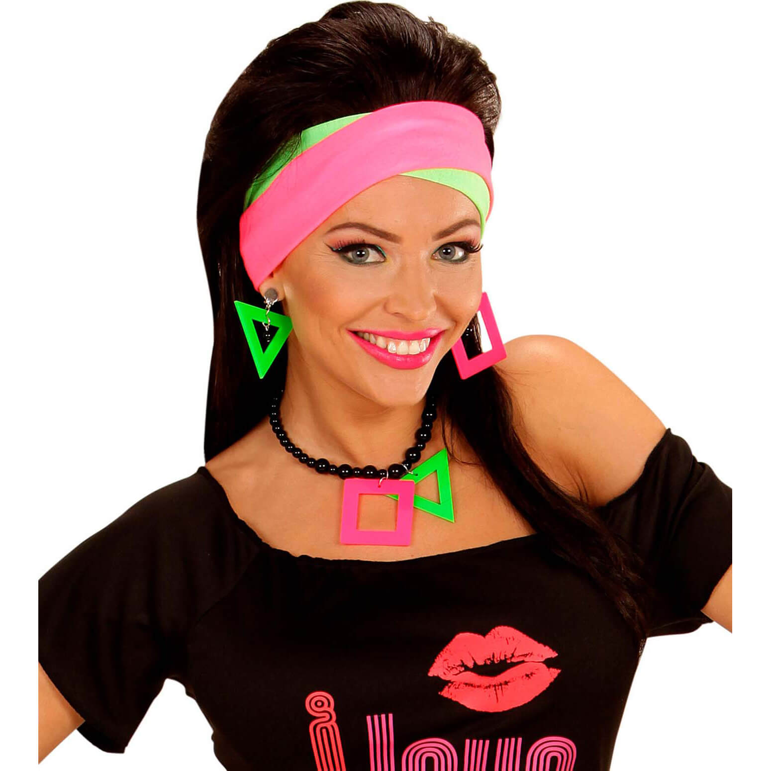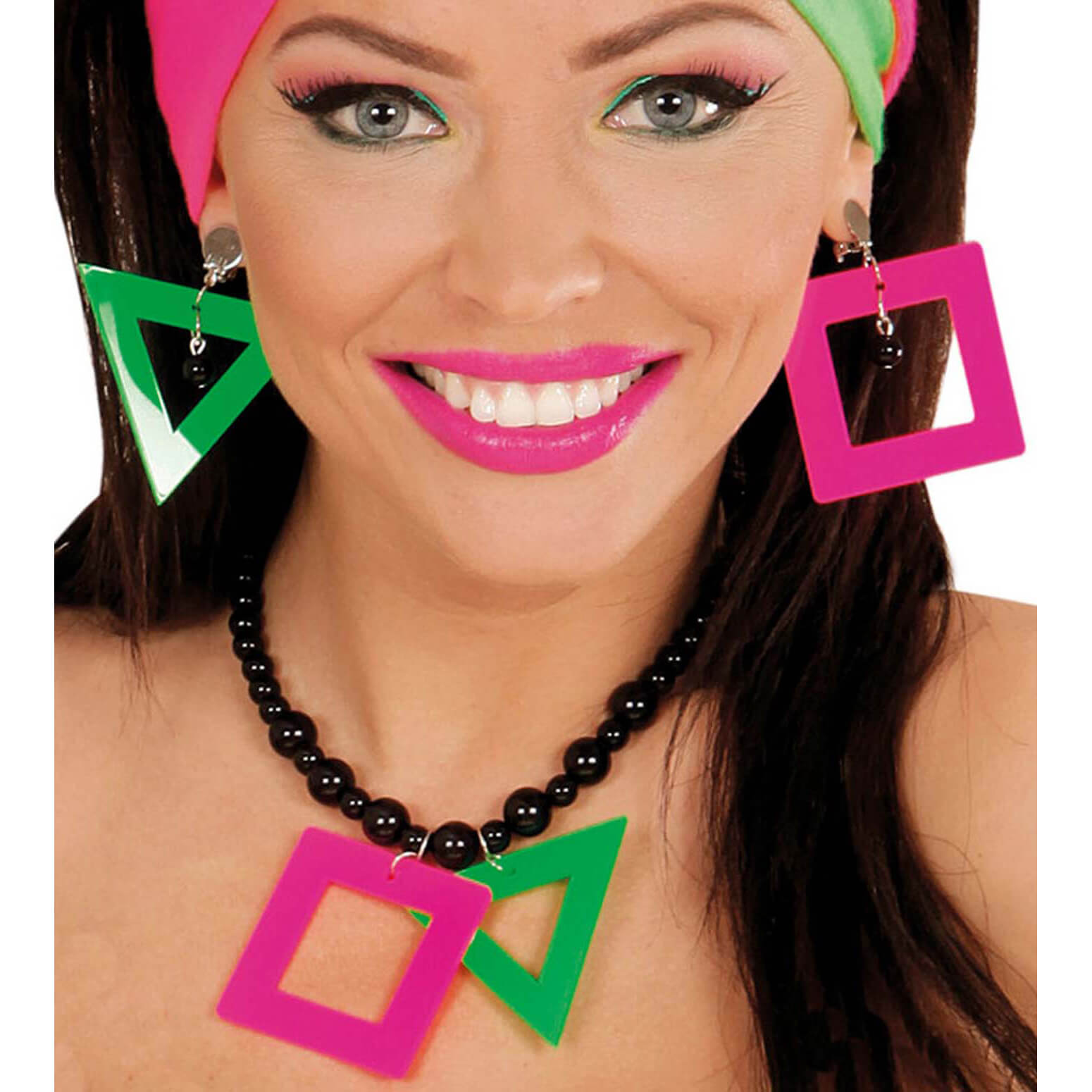 80er Jahre Halskette+Ohrring Set aus Kunststoff Quadrate und Dreiecke neonpink-neongrün – (ARTIKEL/REFERNZ: 8003558058389/WI05838 – Kategorie/Suche: – Hersteller: Widmann S.r.l.)