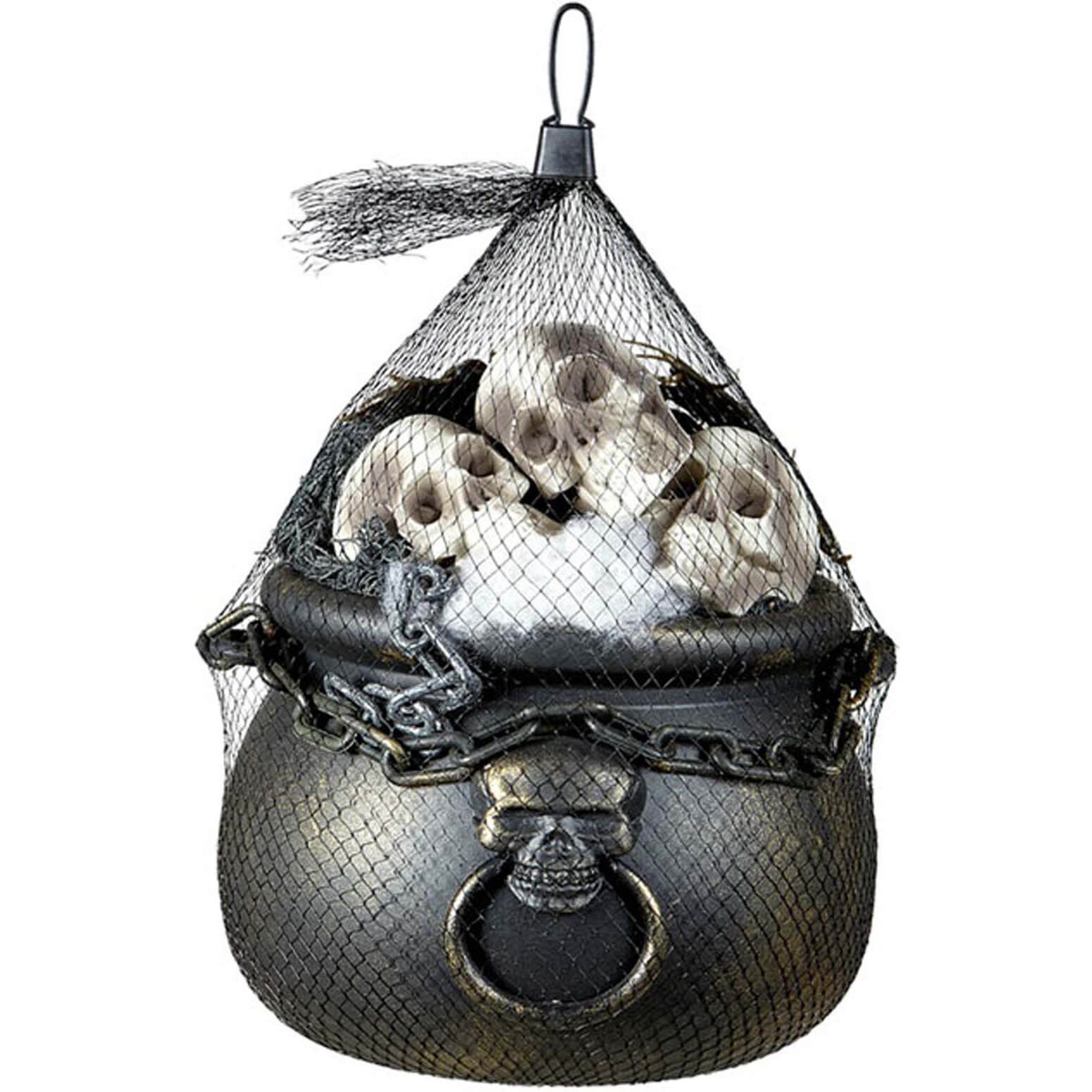 Hexenkessel Deko Standfiguren Set mit Dekostoff Käfer Spinne Spinnenwatte 3 Schädel 1 Kette schwarz-beige