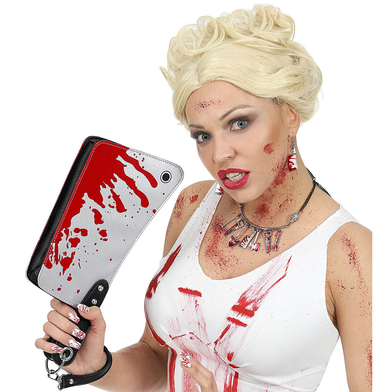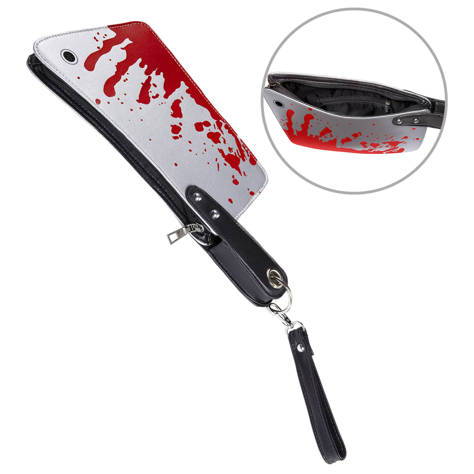 Blutiges Beil Handtasche / Dekoklingenwaffe Henkeltasche mit Reißverschlüssen silber-rot