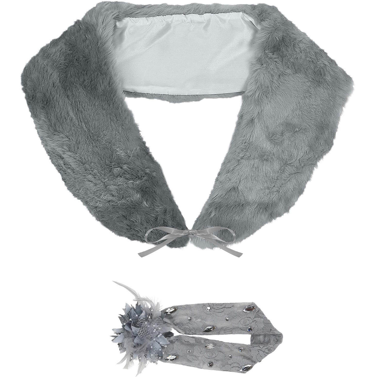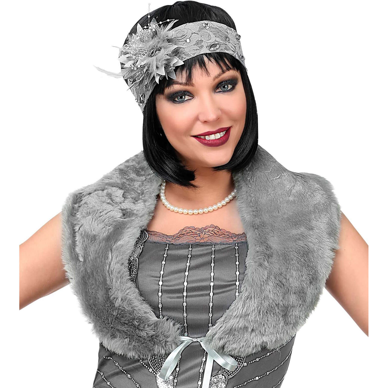 20er Jahre Charleston Schmuckkragen+Stirnband Set falsche Pelzstola mit Paillettenstirnband grau