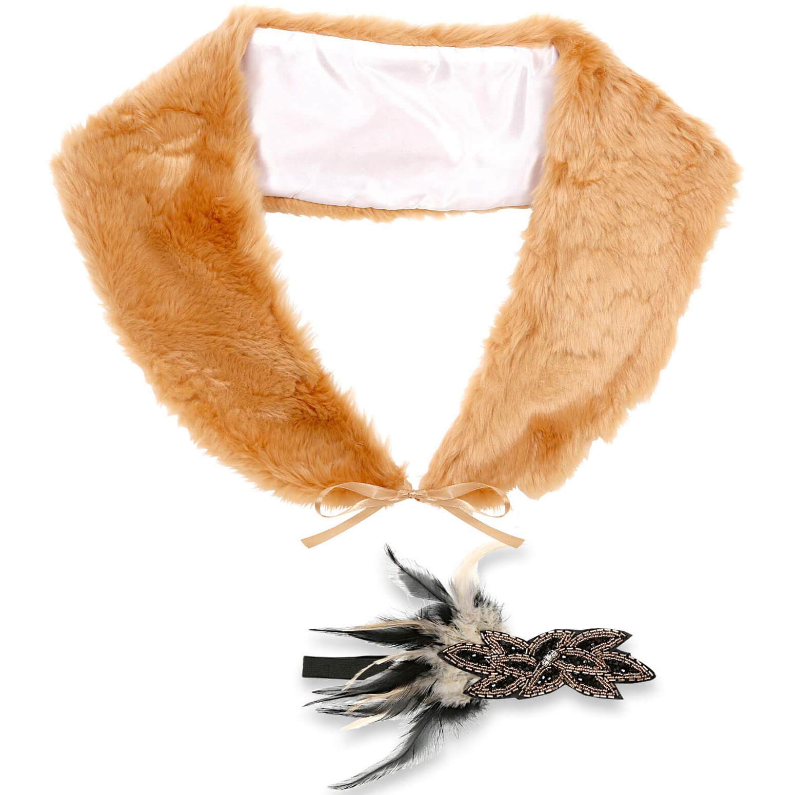 20er Jahre Charleston Schmuckkragen+Stirnband Set falsche Pelzstola mit Paillettenstirnband hellbraun