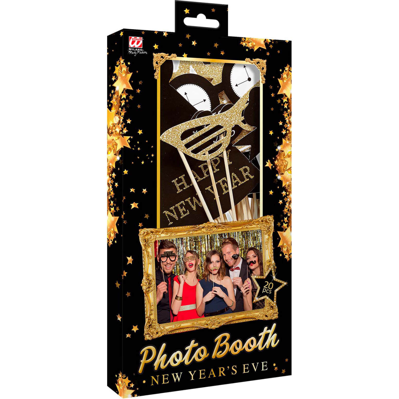 Silvester Deko Fotobox Set Happy New Year mit Glitzer Photobox Tischdekoration schwarz-gold – (ARTIKEL/REFERNZ: 8003558081554/WI08155 – Kategorie/Suche: – Hersteller: Widmann S.r.l.)