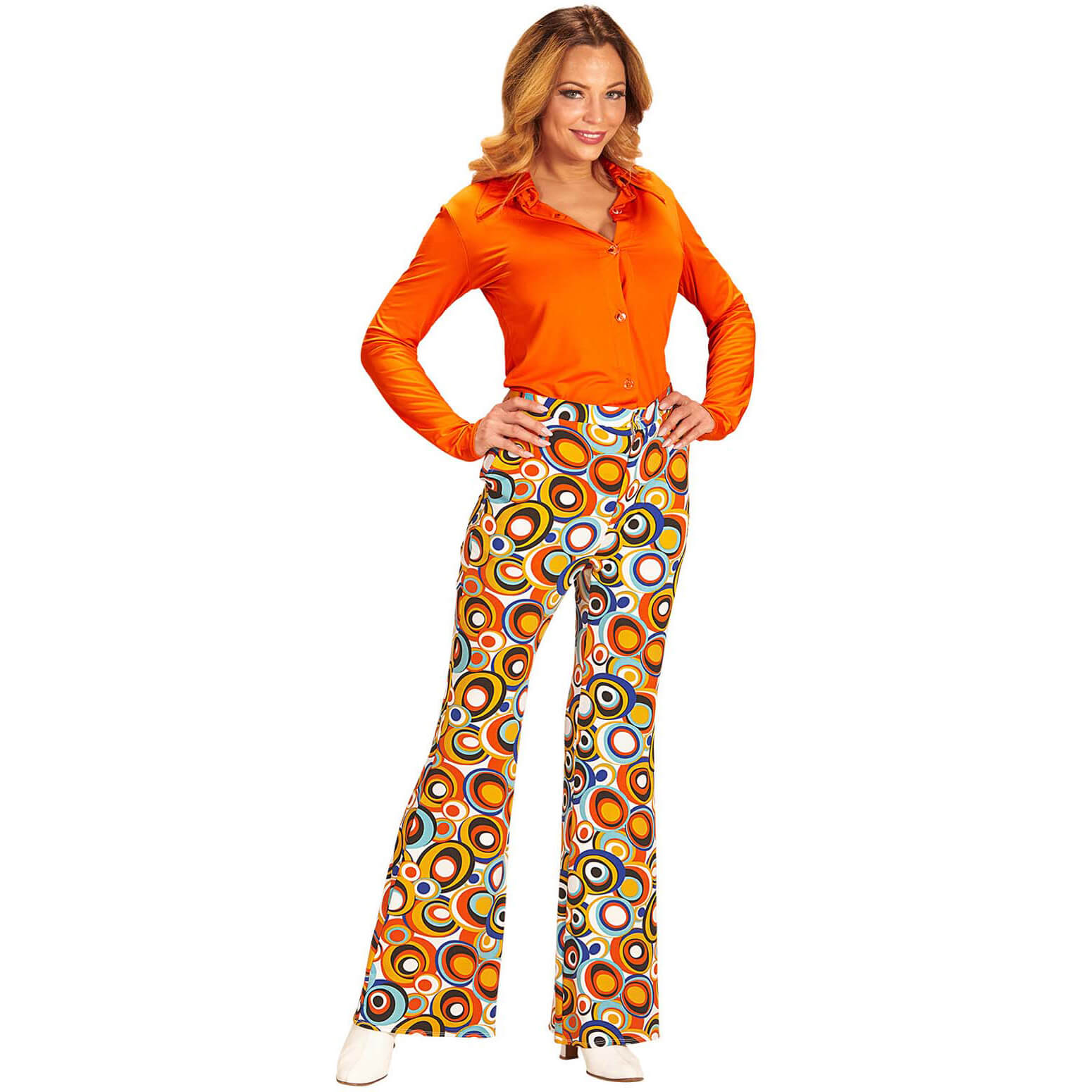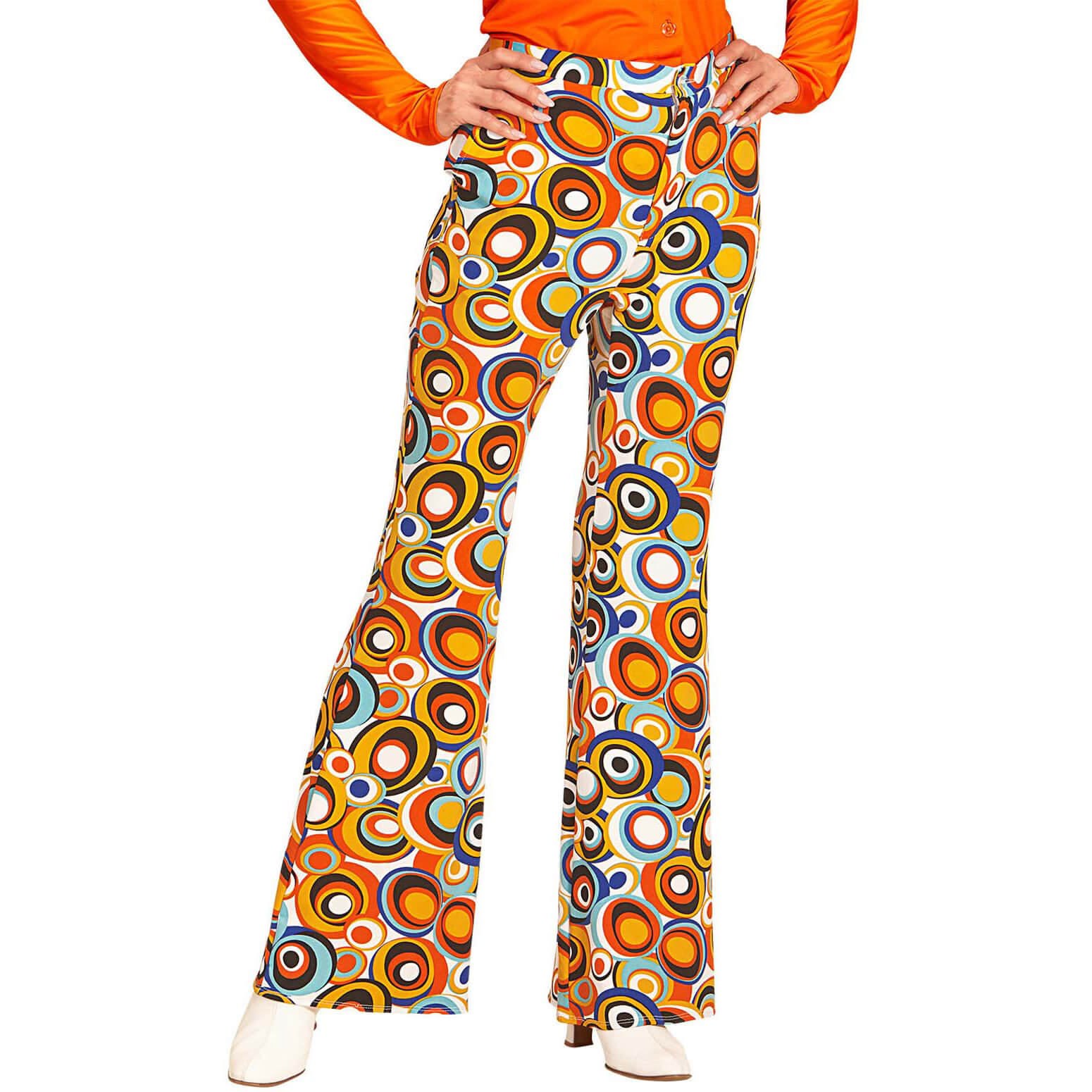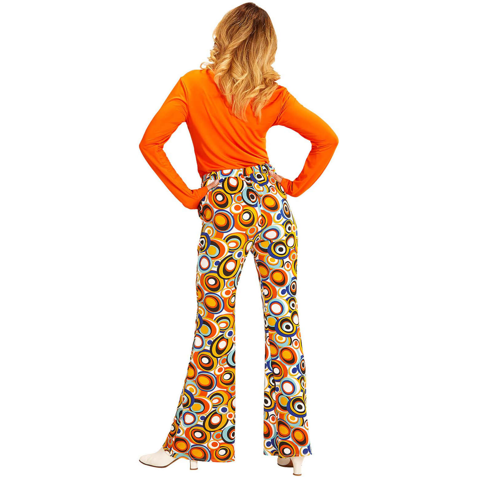 70er Jahre Hippiegirl Schlaghose lang mit Elastan Motiv Groovy Bubbles orange-blau – (ARTIKEL/REFERNZ: 8003558091461/WI09146-8003558091478/WI09147 – Kategorie/Suche: – Hersteller: Widmann S.r.l.)