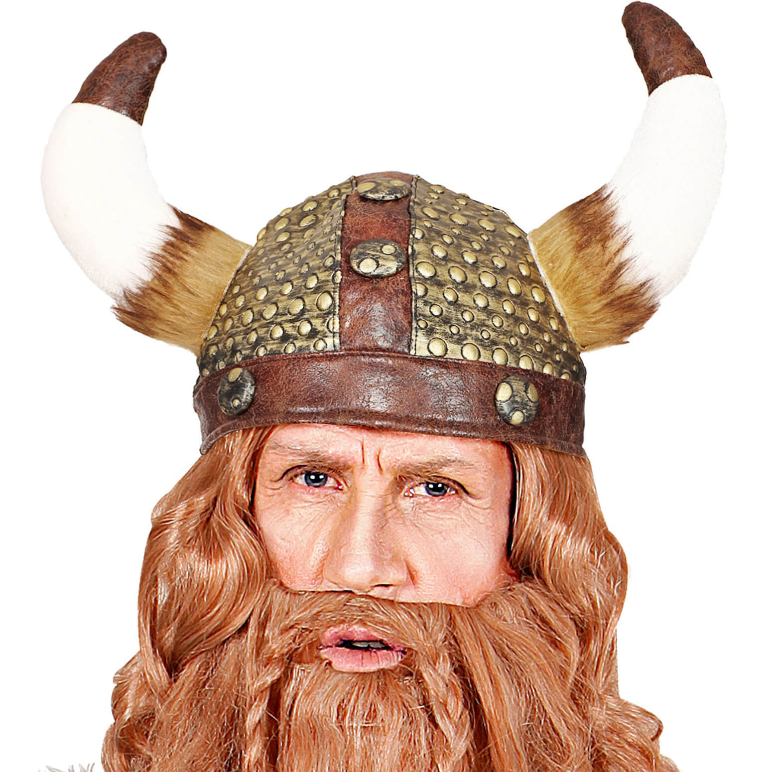 Wikinger Helm mit Hörnern und Fell in Lederoptik braun-gold – (ARTIKEL/REFERNZ: 8003558091690/WI09169 – Kategorie/Suche: Herr der Ringe Game of Thrones GOT Krieger von Winterfell – Hersteller: Widmann S.r.l.)