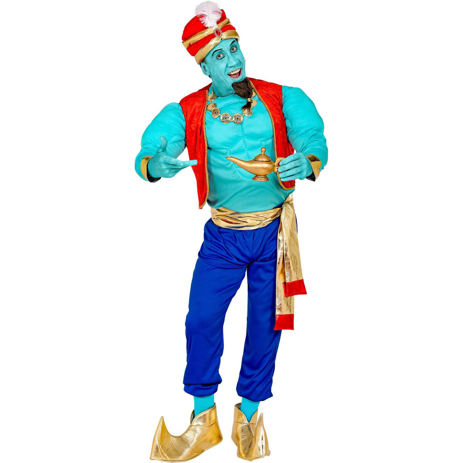 Flaschengeist Genie Kostüm Anzug mit Muskelshirt Turban und Überschuhen bunt – (ARTIKEL/REFERNZ: 8003558102310/WI10231-8003558102327/WI10232-8003558102334/WI10233-8003558102341/WI10234 – Kategorie/Suche: Disney Aladin Alladin – Hersteller: Widmann S.r.l.)