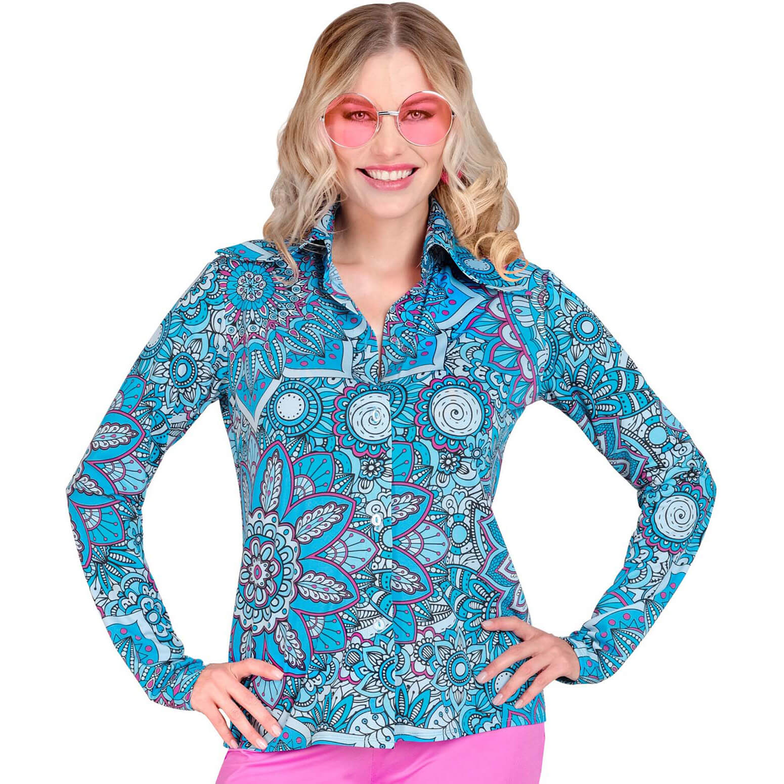 70er Jahre Hippiegirl Hemd Bluse mit Elastan Motiv Mandala blau-pink – (ARTIKEL/REFERNZ: 8003558103812/WI10381-8003558103829/WI10382 – Kategorie/Suche: – Hersteller: Widmann S.r.l.)