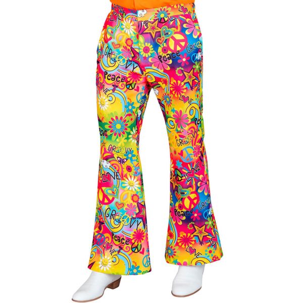 70er Jahre Hippieboy Schlaghose lang in fester Qualität mit Taschen Motiv Peace und Love bunt – (ARTIKEL/REFERNZ: 8003558105779/WI10577-8003558105786/WI10578-8003558105793/WI10579 – Kategorie/Suche: – Hersteller: Widmann S.r.l.)
