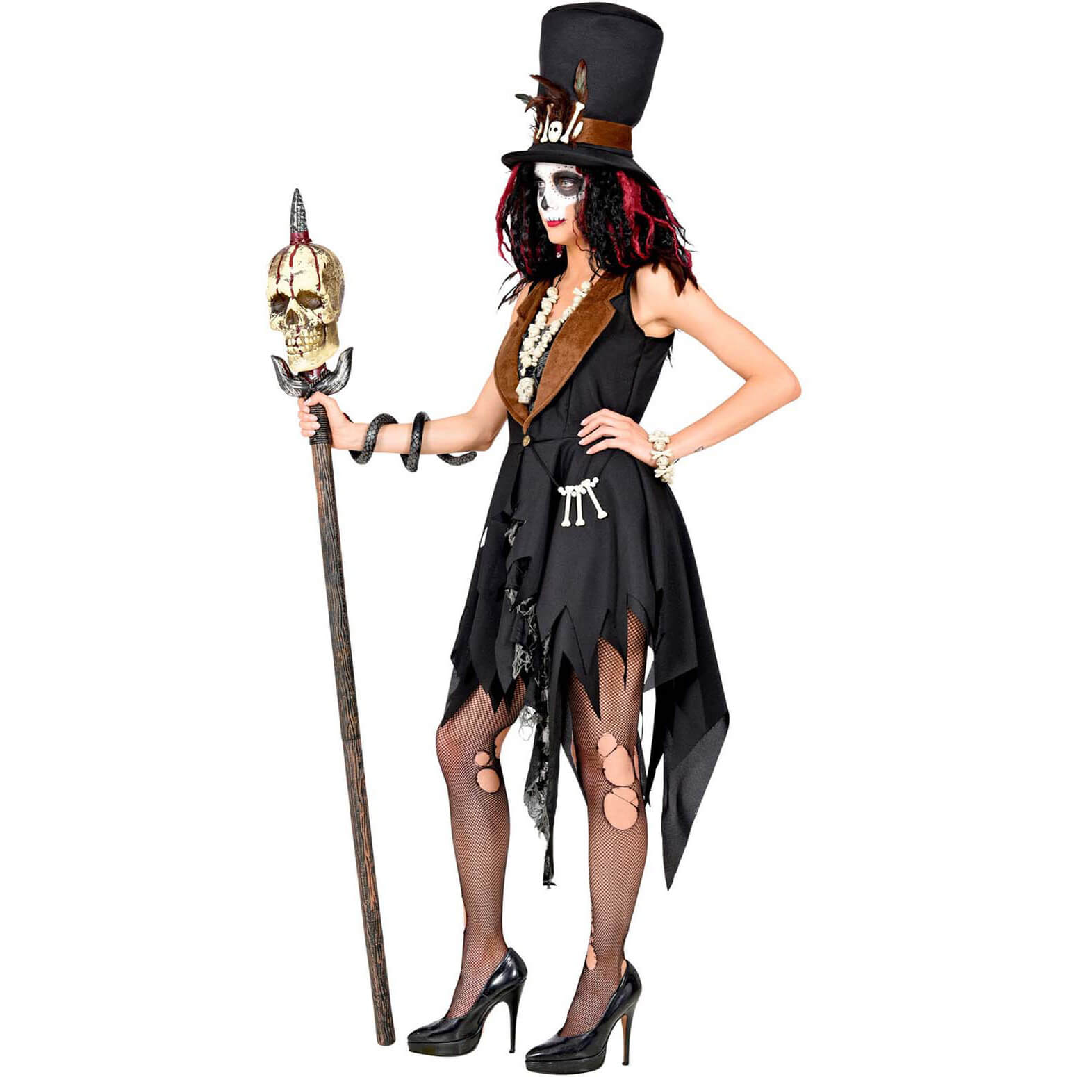 Voodoo Priesterin Kostüm Kleid halblang mit Federn Deluxe schwarz-braun – (ARTIKEL/REFERNZ: 8003558107315/WI10731-8003558107322/WI10732-8003558107339/WI10733-8003558107346/WI10734 – Kategorie/Suche: – Hersteller: Widmann S.r.l.)