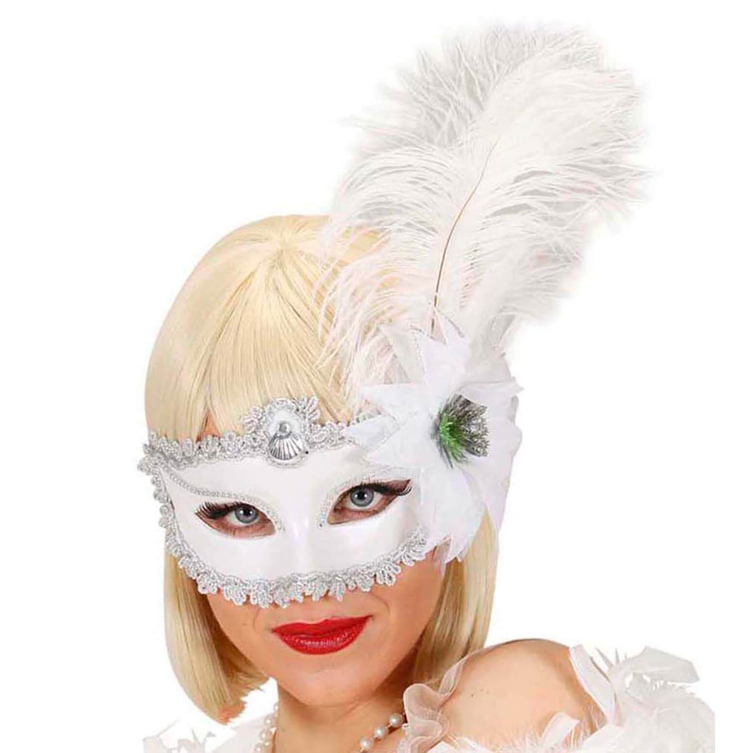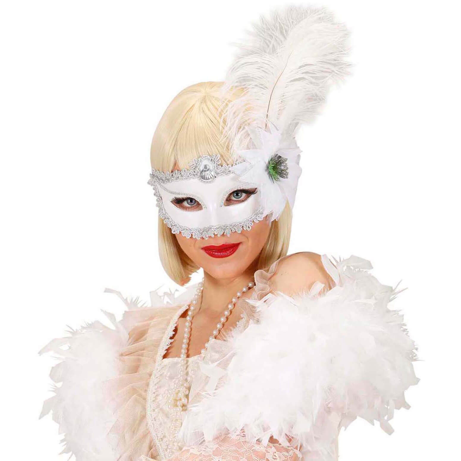 Edle venezianische Dominomaske mit Federn großer Blüte und Muschel weiß-silber – (ARTIKEL/REFERNZ: 8003558179503/WI1795W – Kategorie/Suche: – Hersteller: Widmann S.r.l.)