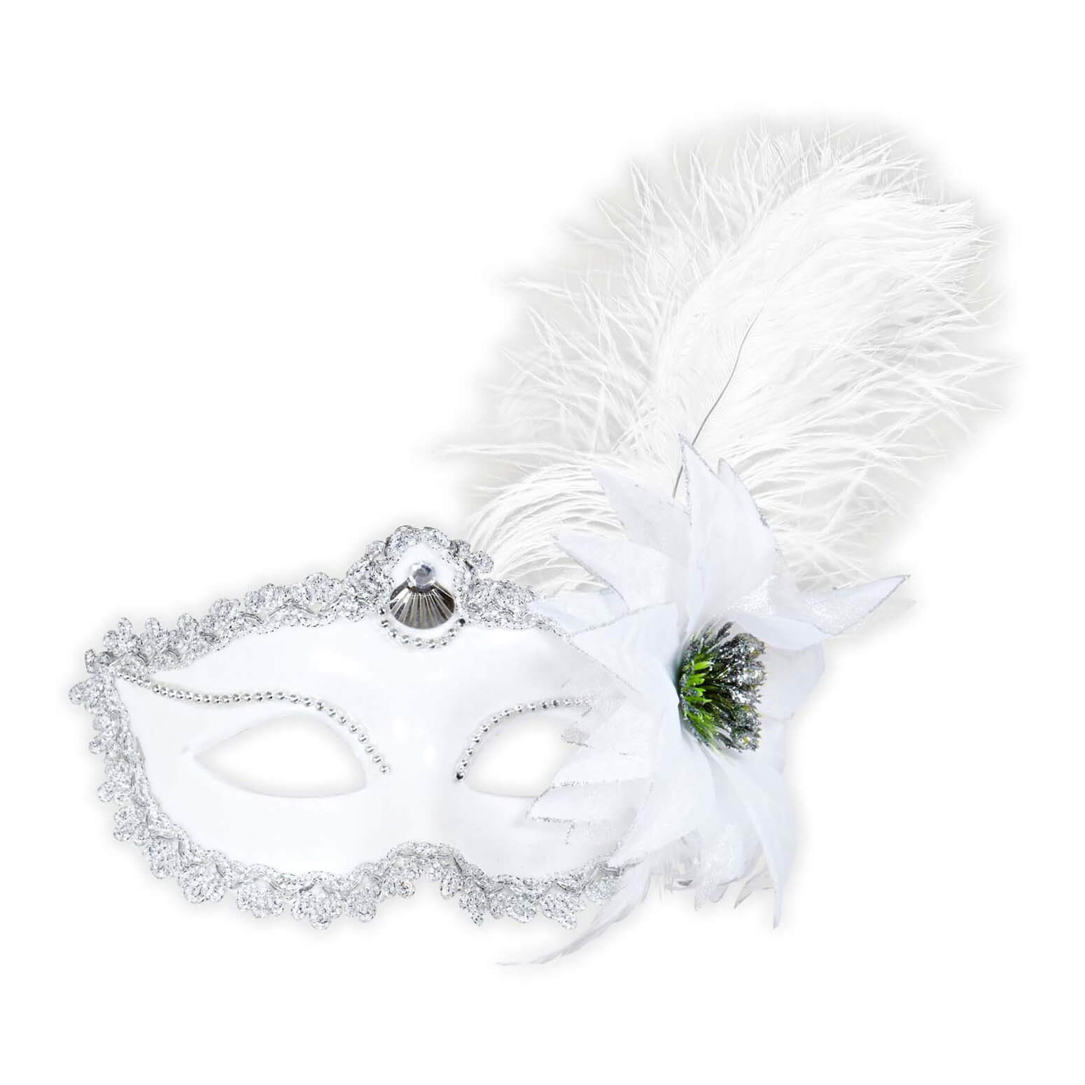 Edle venezianische Dominomaske mit Federn großer Blüte und Muschel weiß-silber