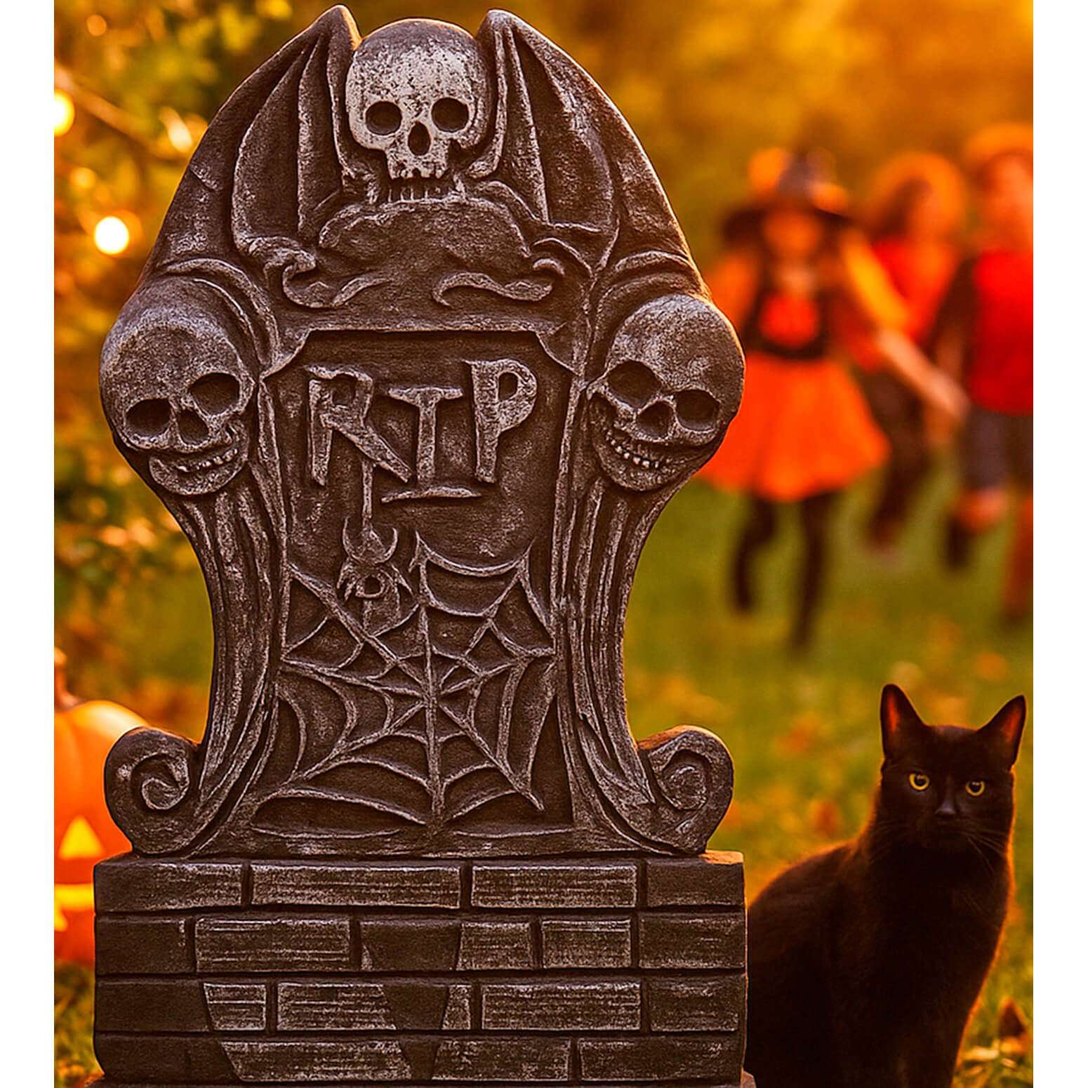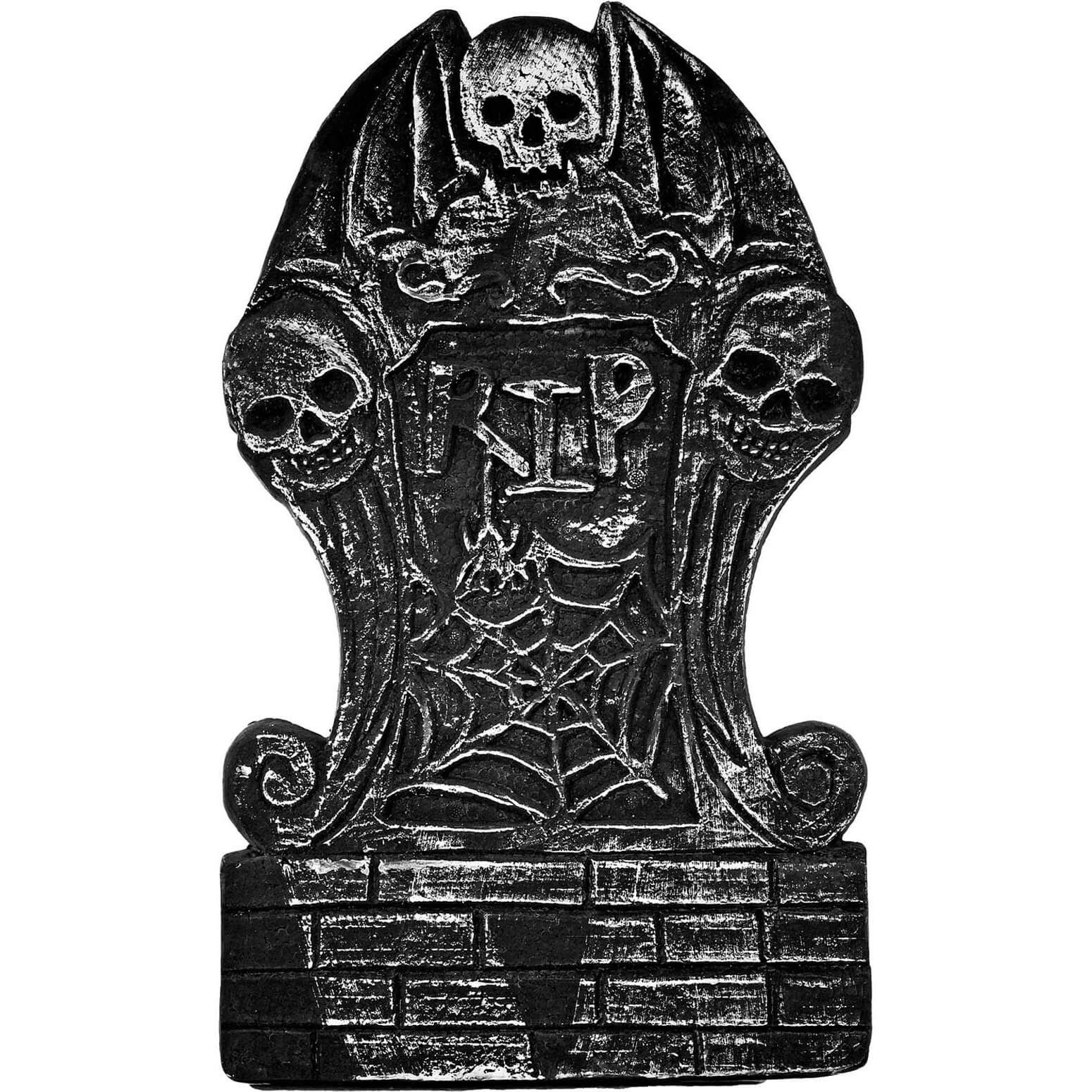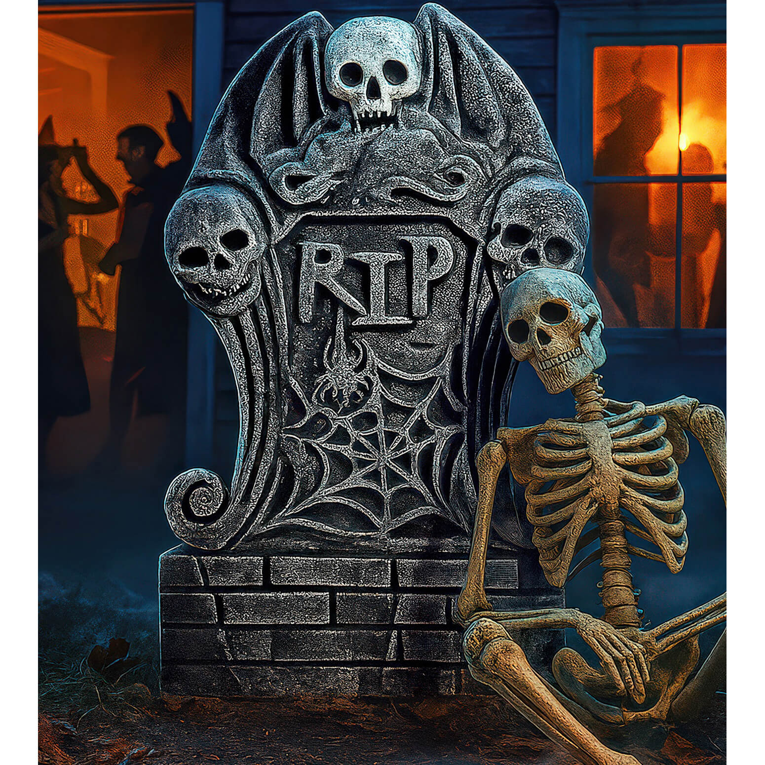 Grabstein RIP Deko Standfigur aus Styropor 34x59cm 3 Schädel mit Spinnennetz grau-weiß