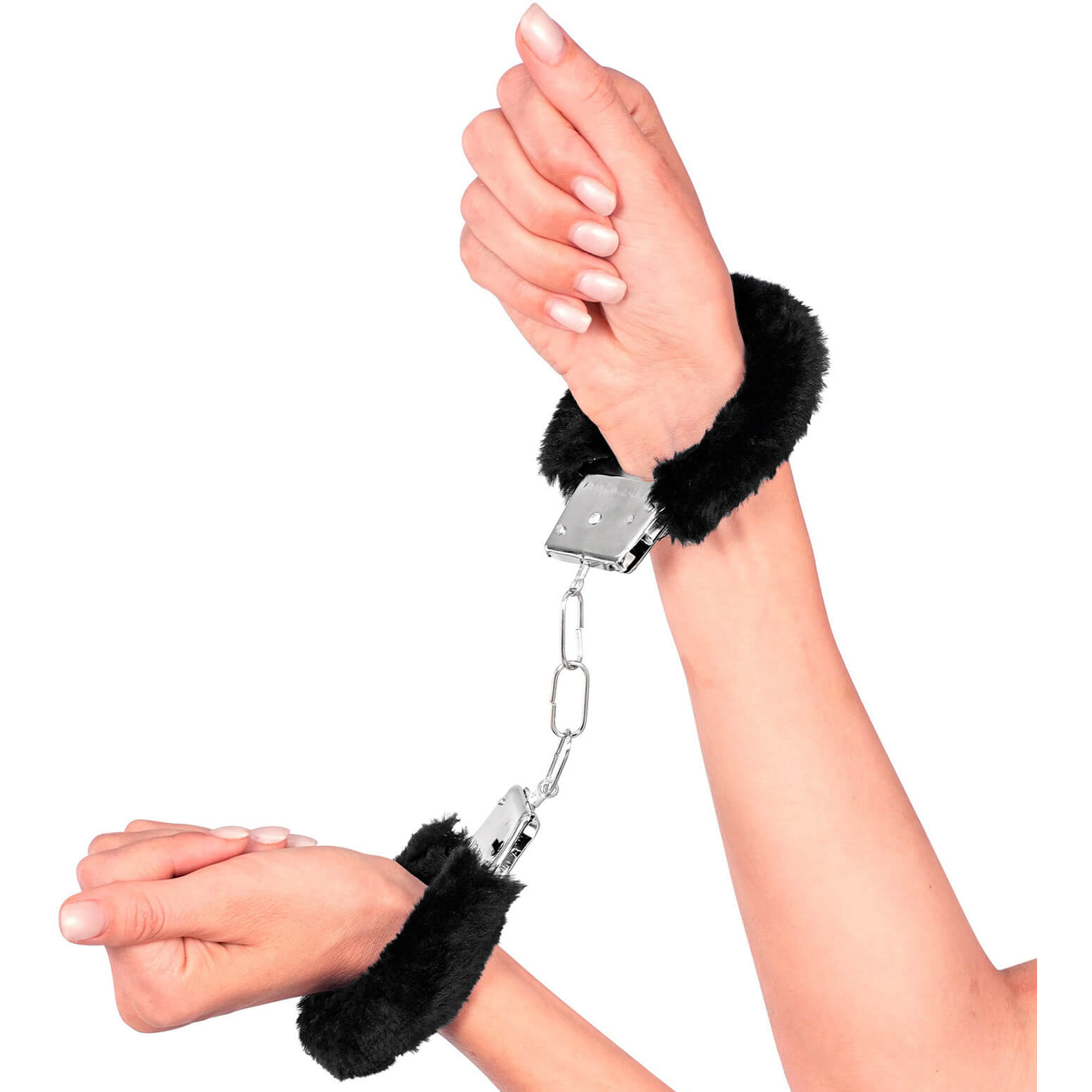 Polizei Sträfling / Rocker Handschellen mit abnehmbarem Plüschbezug und Schlüssel silber-schwarz