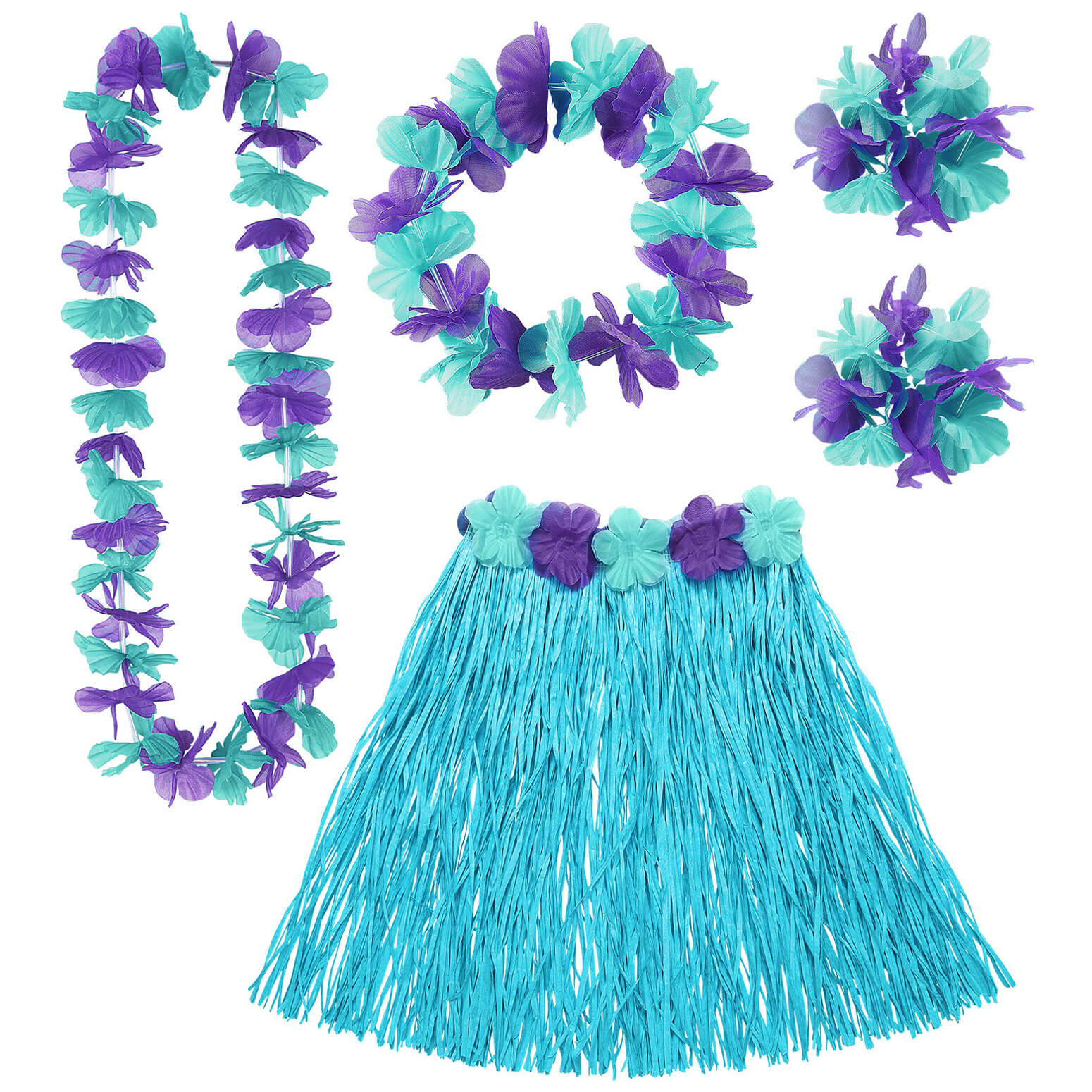 Hawaii/Afrika Dschungel Rock Bastrock kurz mit Blumen Hawaiikette Lei Armbändern und Haarkranz türkis-lila – (ARTIKEL/REFERNZ: 8003558245673/WI24567 – Kategorie/Suche: – Hersteller: Widmann S.r.l.)