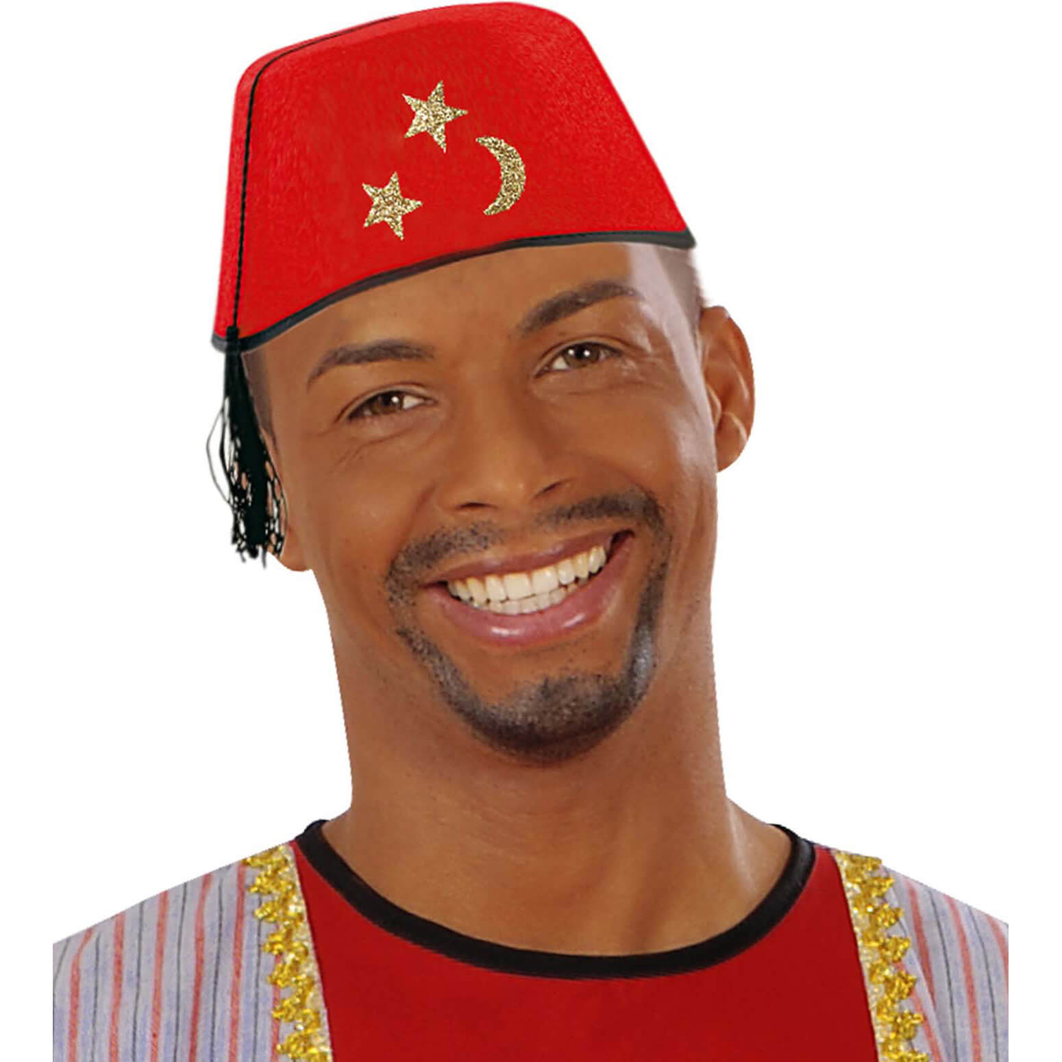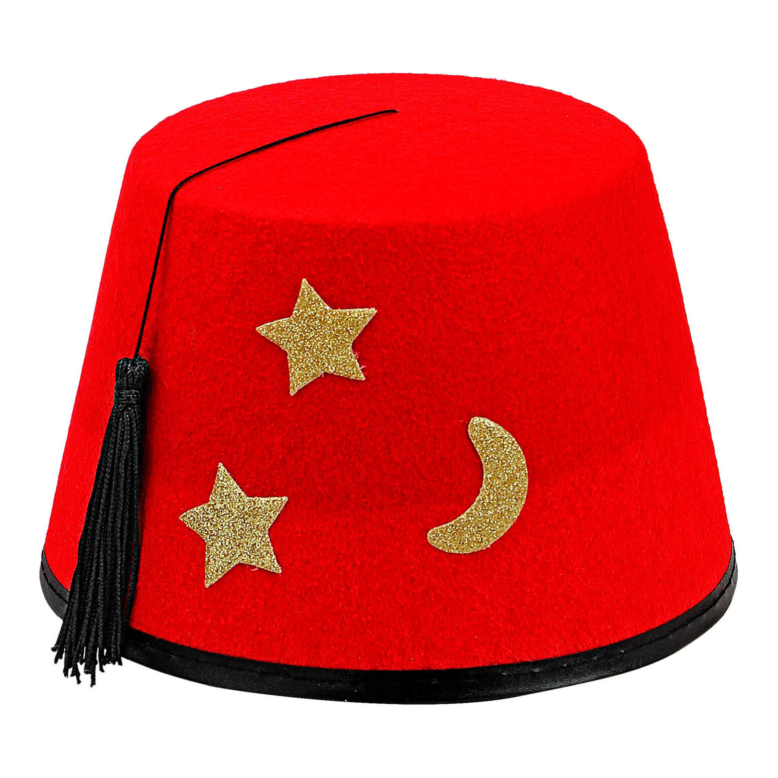 Orientalen Hut Fez mit Mond und Sternen aus Filz rot-gold