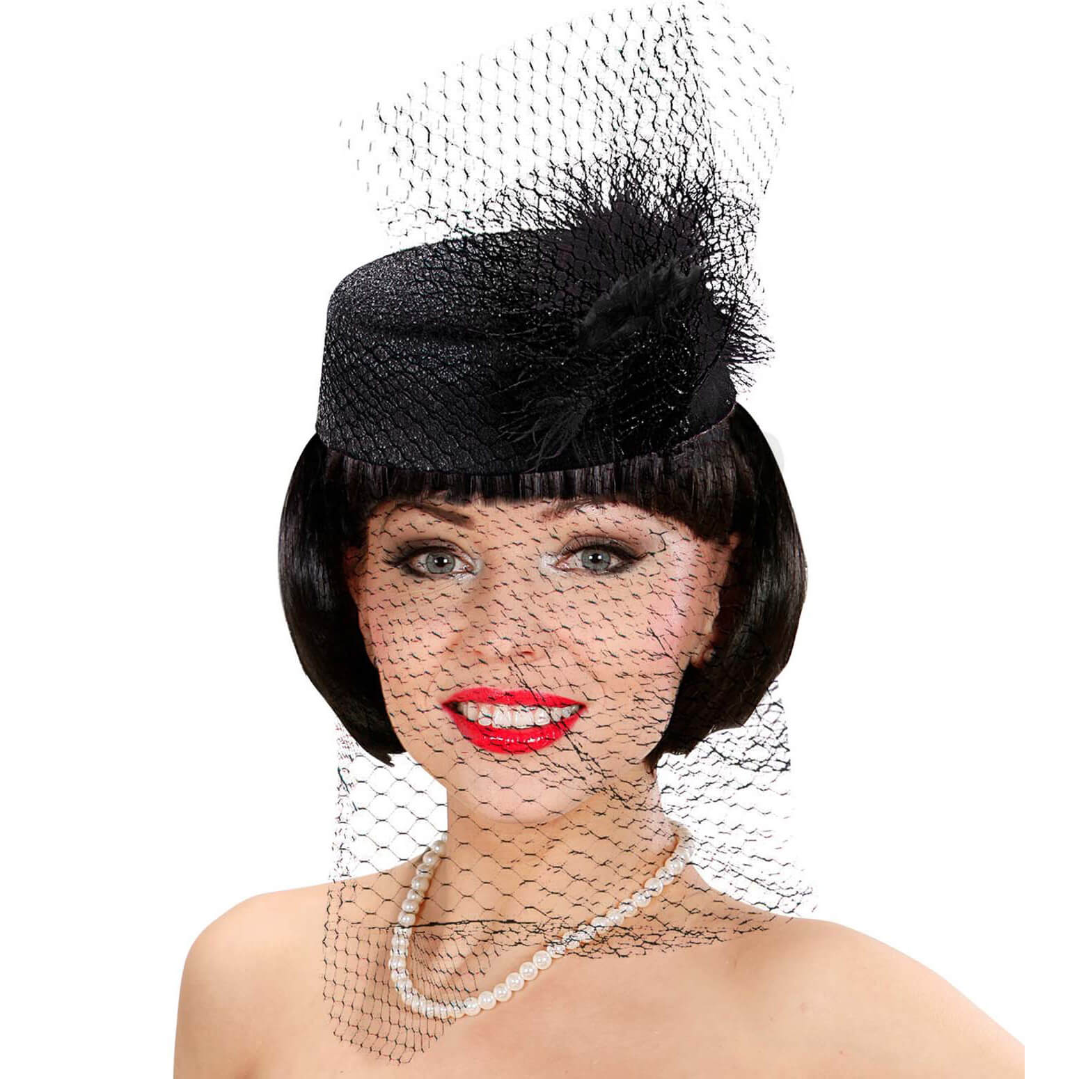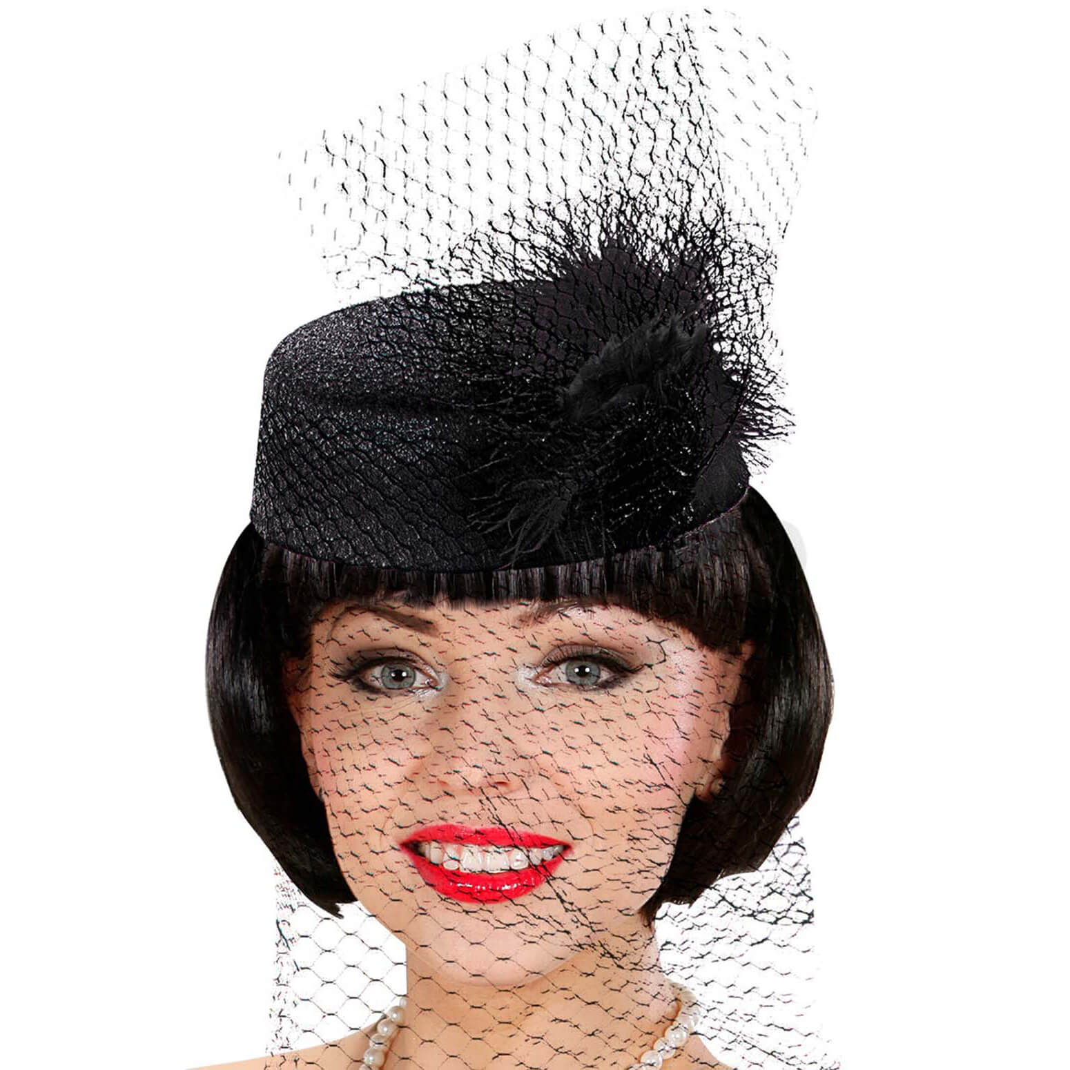 20er Jahre/50er Jahre Damenhut Pillbox mit Tüllschleier und Feder Tina schwarz – (ARTIKEL/REFERNZ: 8003558255207/WI2552D – Kategorie/Suche: – Hersteller: Widmann S.r.l.)