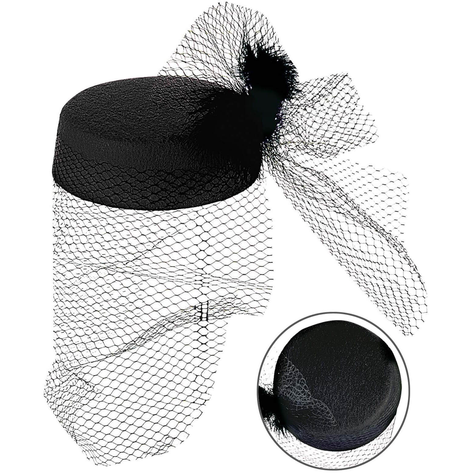 20er Jahre / 50er Jahre Damenhut Pillbox mit Tüllschleier und Feder Tina schwarz