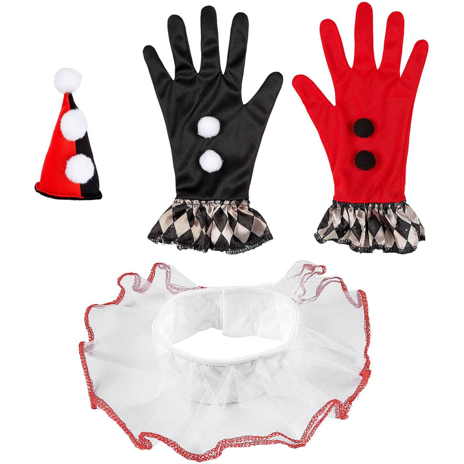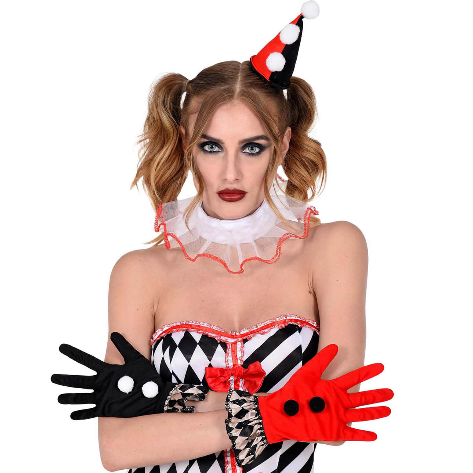 Clown Harlekin Schmuckkragen+Handschuhe+Hut mit Tüll am Kragen und Minihütchen mit Clip schwarz-rot