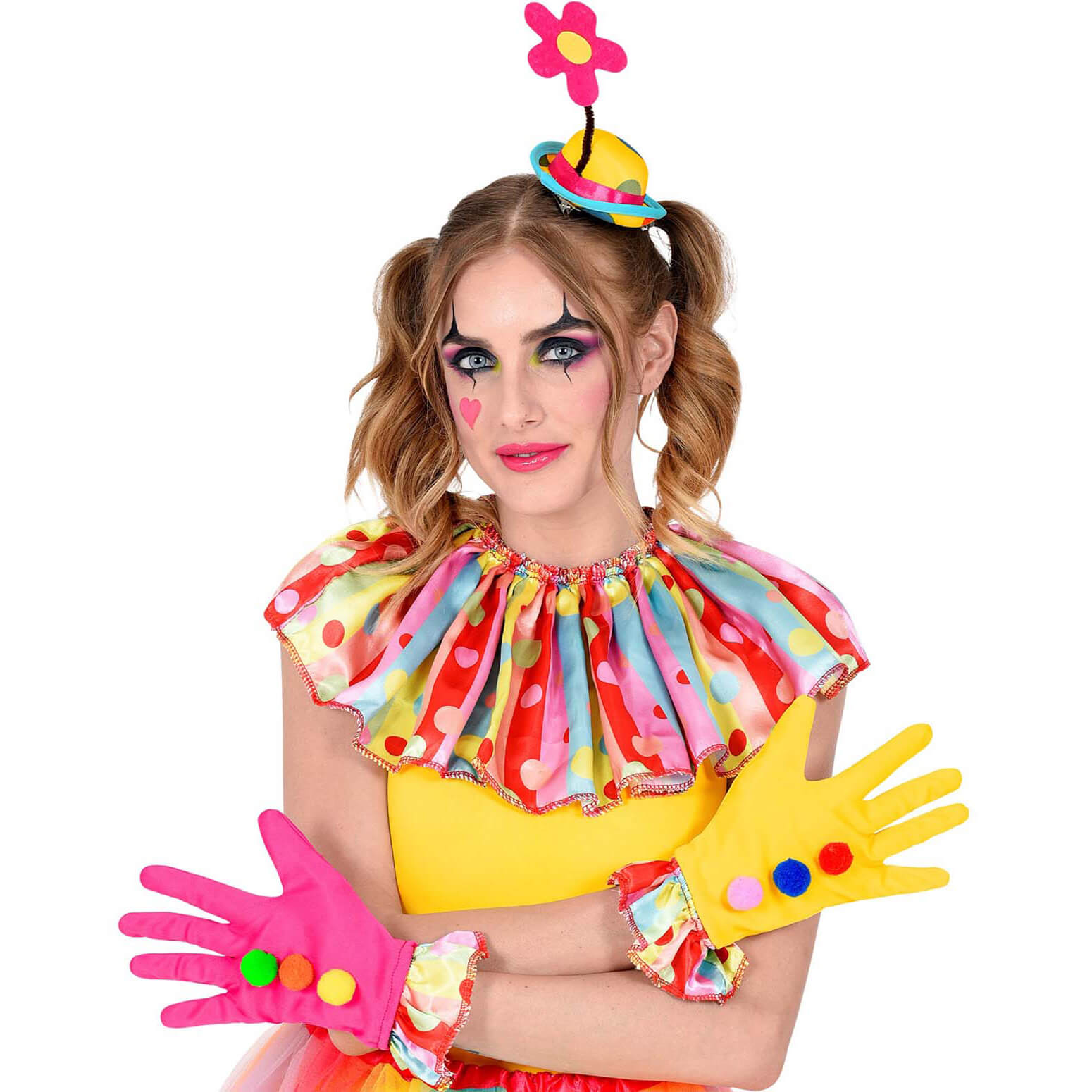 Clown Harlekin Schmuckkragen+Handschuhe+Hut mit Punkte Kragen und Minihütchen mit Clip pink-blau-gelb bunt – (ARTIKEL/REFERNZ: 8003558293438/WI29343 – Kategorie/Suche: – Hersteller: Widmann S.r.l.)