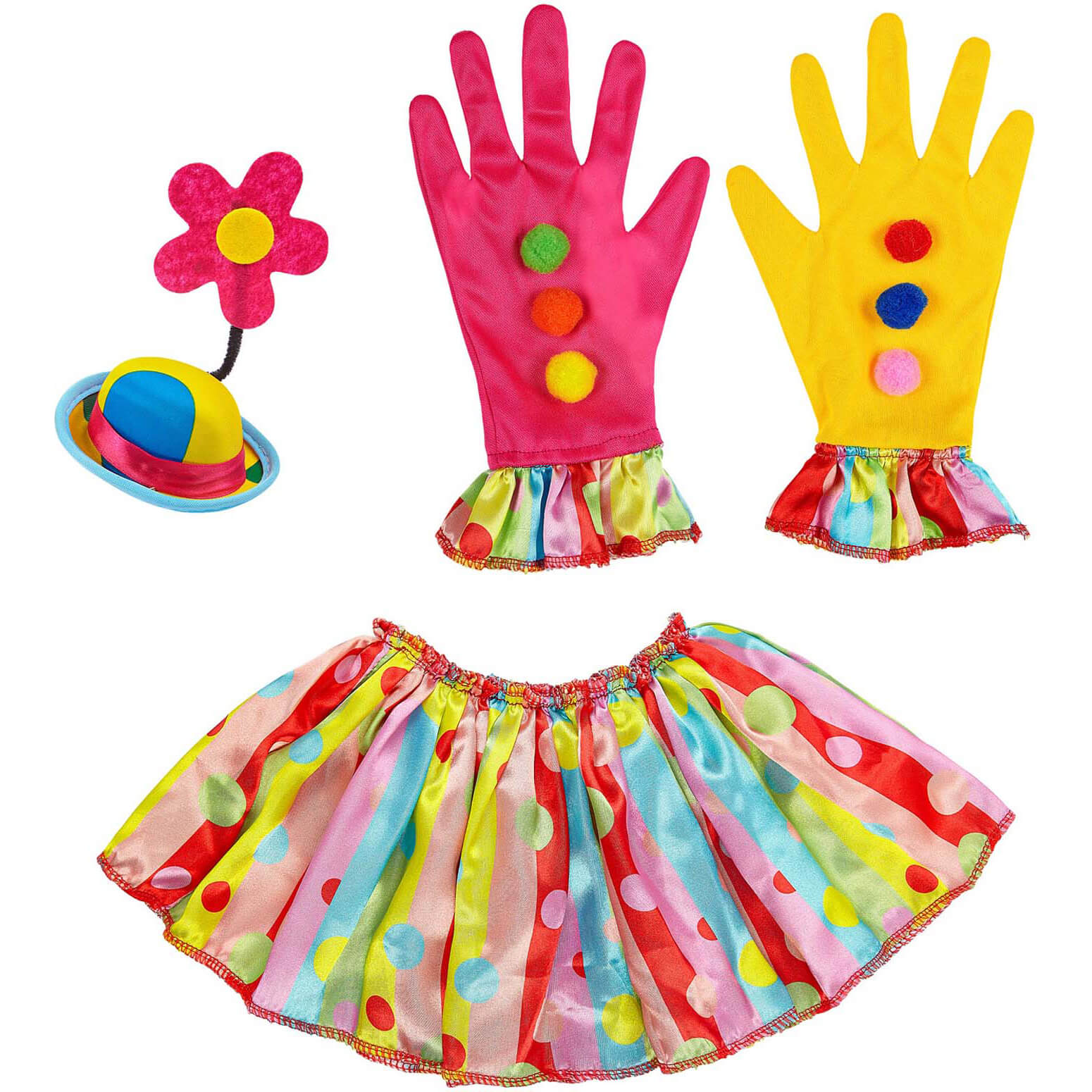 Clown Harlekin Schmuckkragen+Handschuhe+Hut mit Punkte Kragen und Minihütchen mit Clip pink-blau-gelb bunt