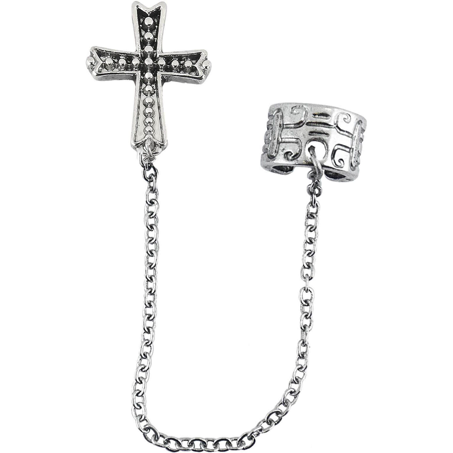 Biker Rocker / Gothic Nasenring mit Ohrring und Verbindungskette Nonpiercing für Ohr und Nase mit Kreuz silber