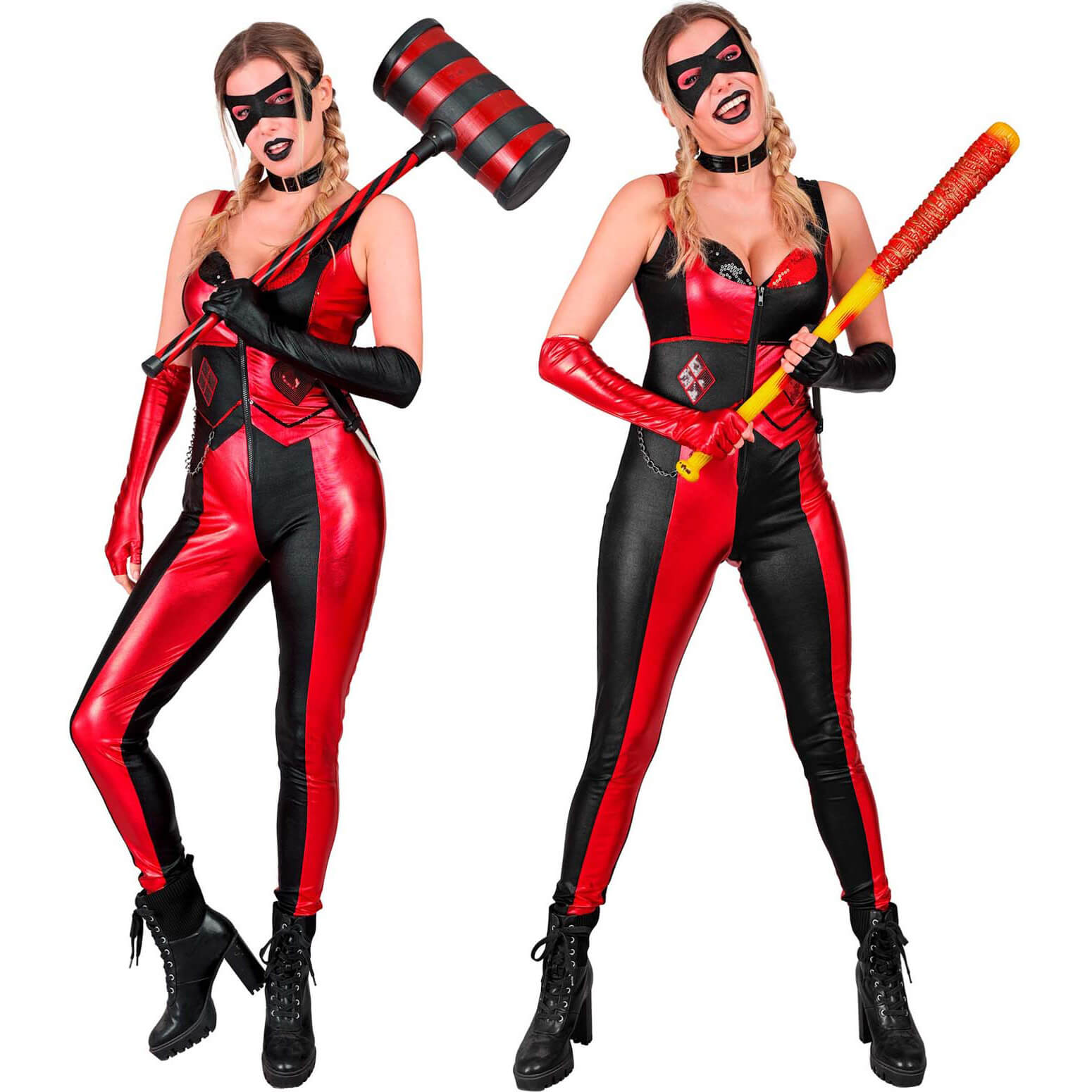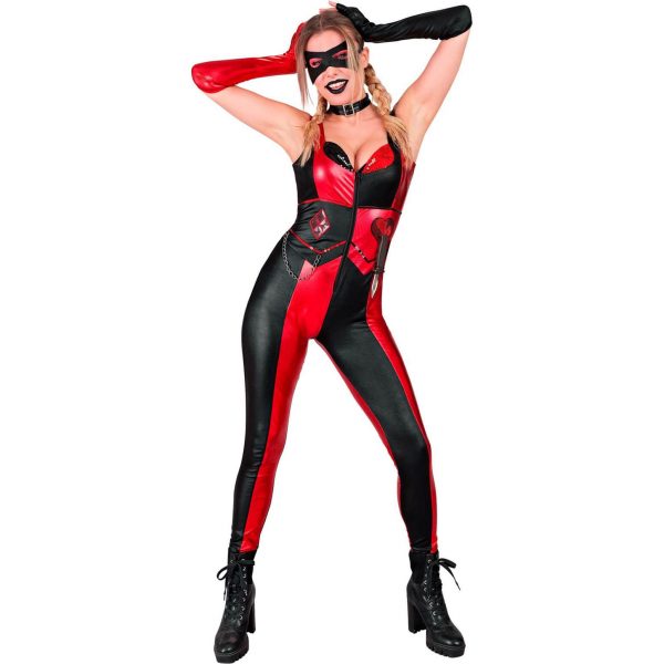 Superheldin Harley Kostüm Overall Catsuit mit Trägern Kettchen und Armstulpen Evil Harlequin schwarz-rot – (ARTIKEL/REFERNZ: 8003558303991/WI30399-8003558303915/WI30391-8003558303922/WI30392-8003558303939/WI30393 – Kategorie/Suche: Marvel DC Disney Comics Batman The Joker Harley Quinn – Hersteller: Widmann S.r.l.)