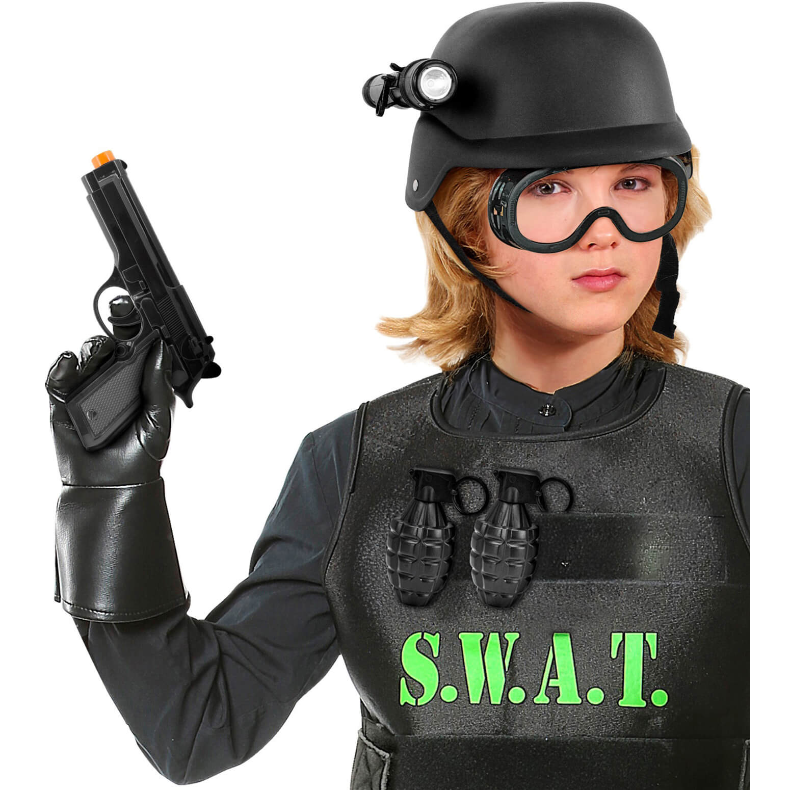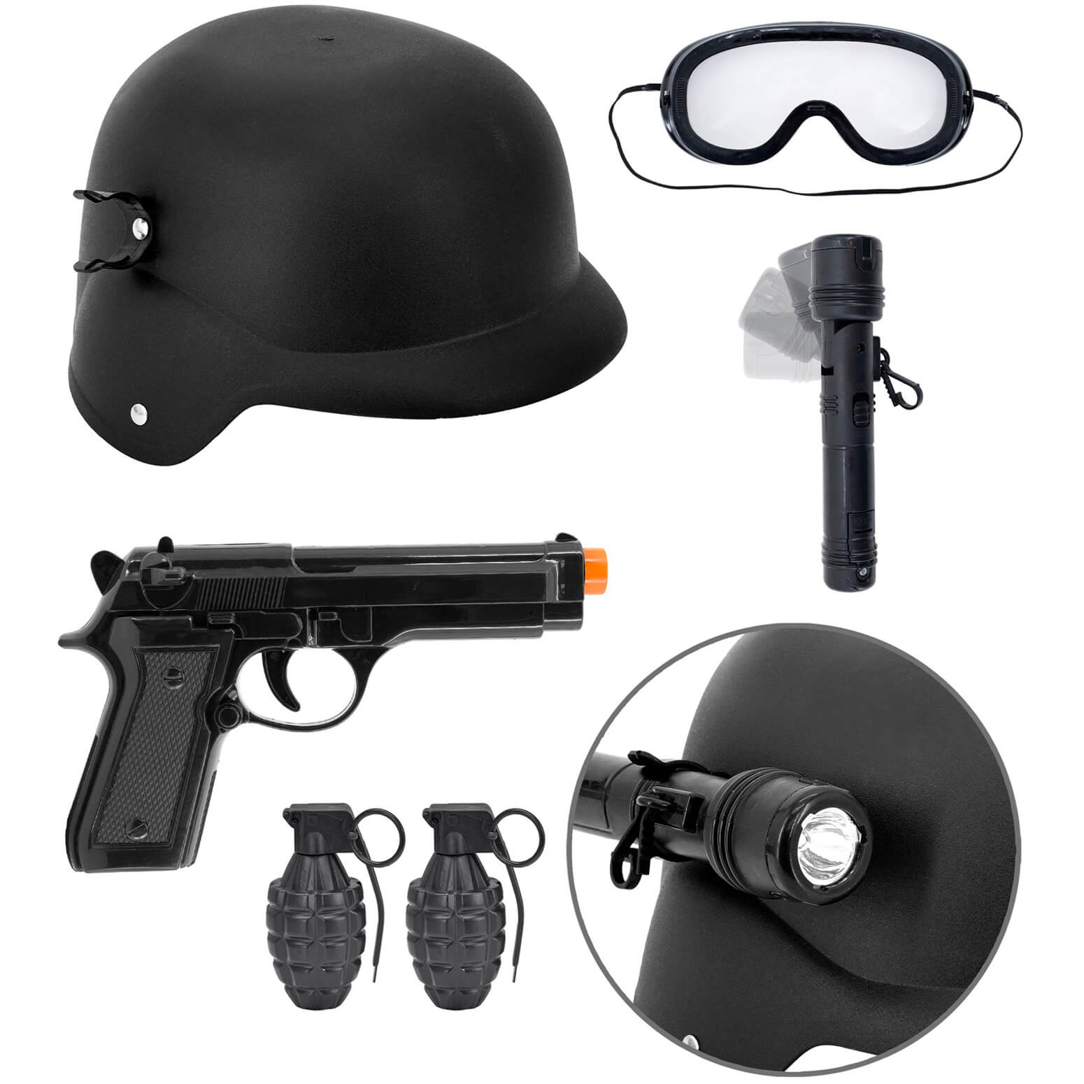 Polizei FBI SWAT Waffen+Helm Set Sturmbrille 2 Handgranaten Helm- oder Taschenlampe Pistole schwarz