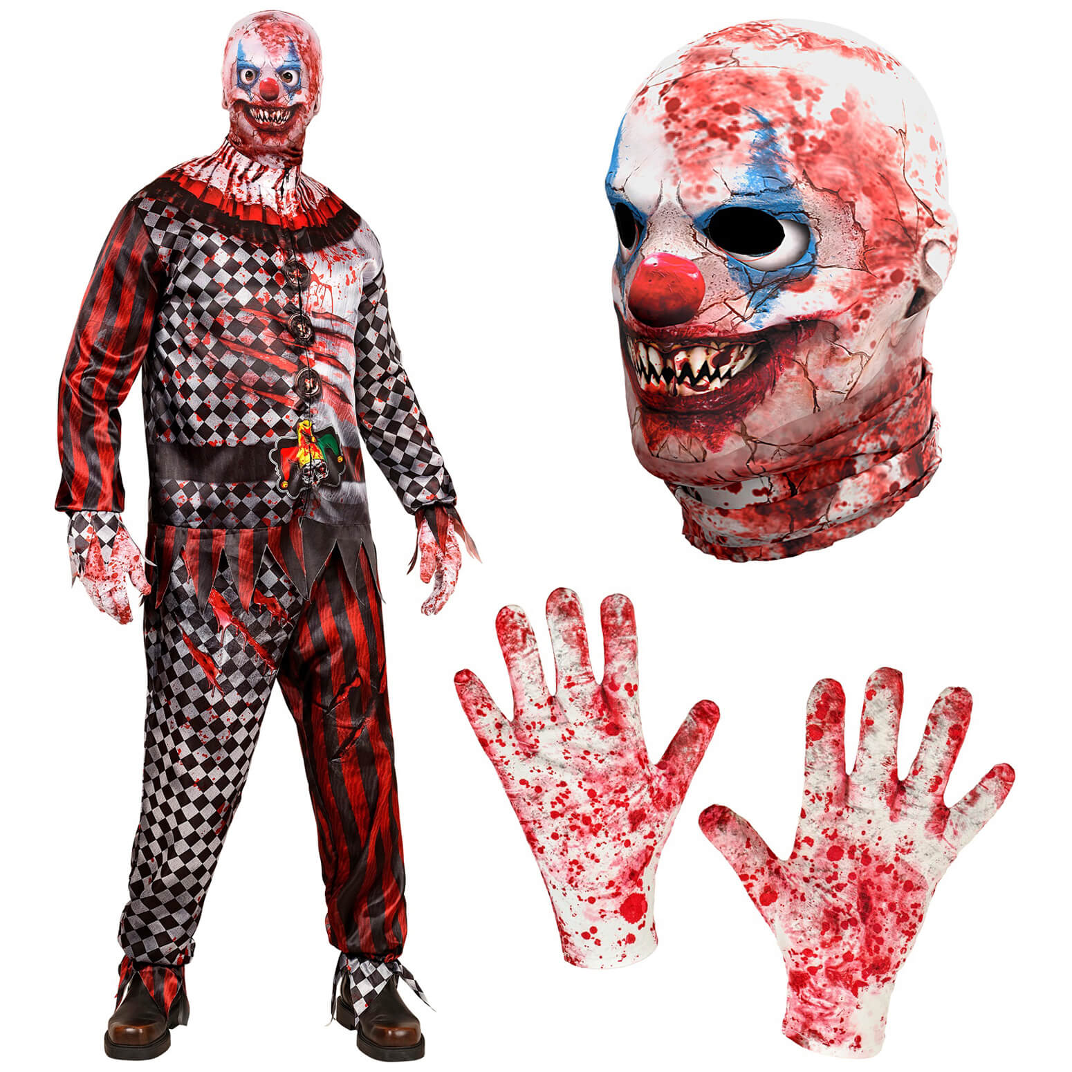 Böser Clown Kostüm Anzug FAST KOSTUME Jogginganzug Handschuhe Stoffmaske blutig schwarz-rot