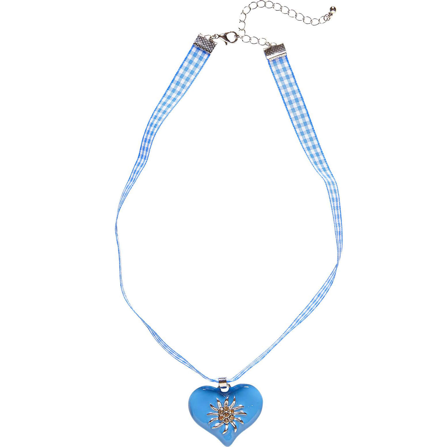Trachten Halsband mit Anhänger Karoband mit glänzendem Herz und Edelweiß blau-silber