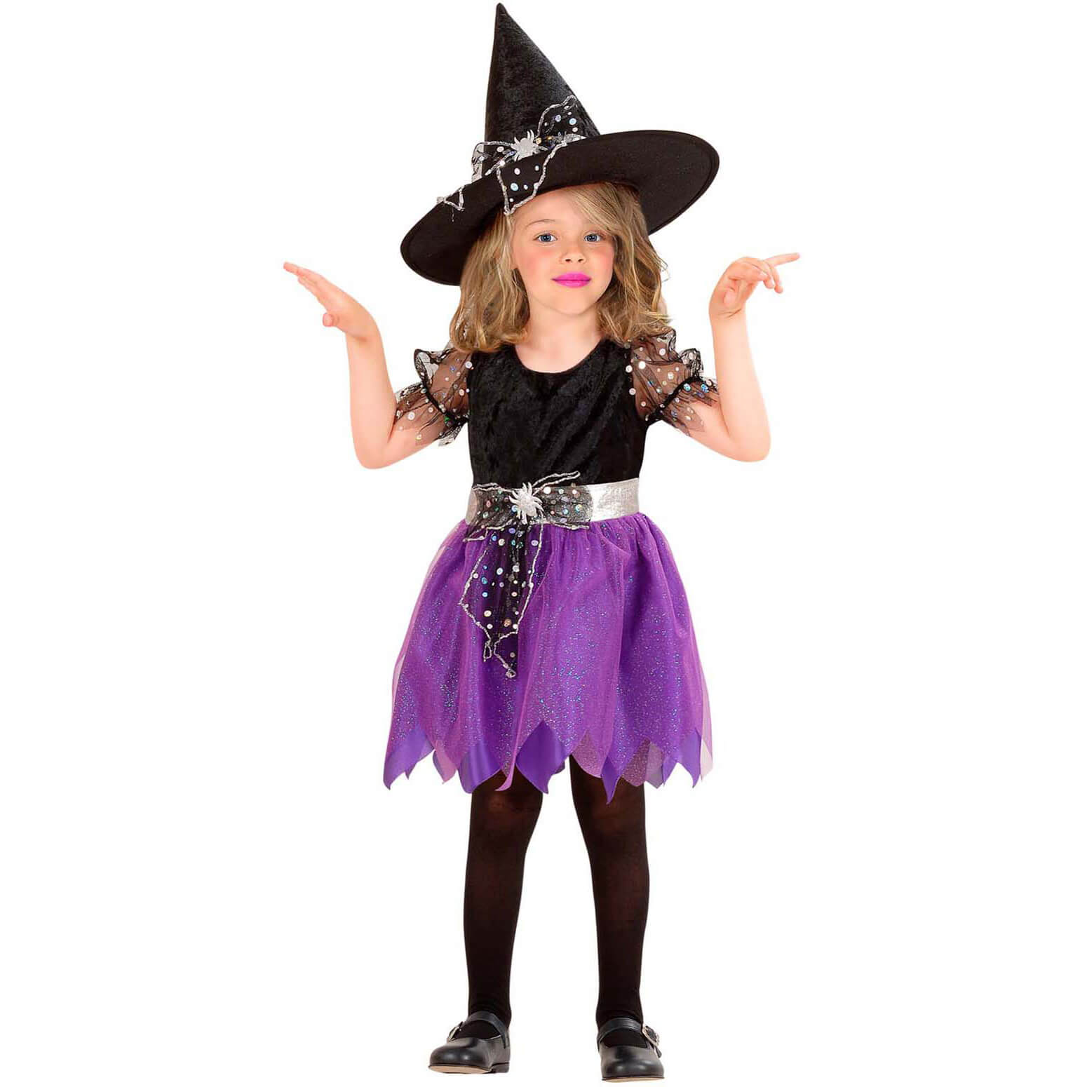 Hexe Kinderkostüm Kleid kurz mit Schleife und Glitzer lila-schwarz – (ARTIKEL/REFERNZ: 8003558492381/WI49238-8003558492398/WI49239 – Kategorie/Suche: – Hersteller: Widmann S.r.l.)