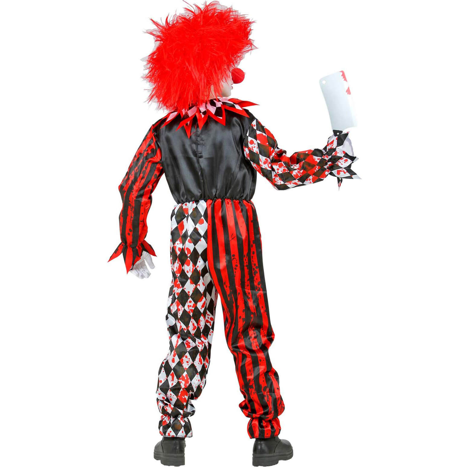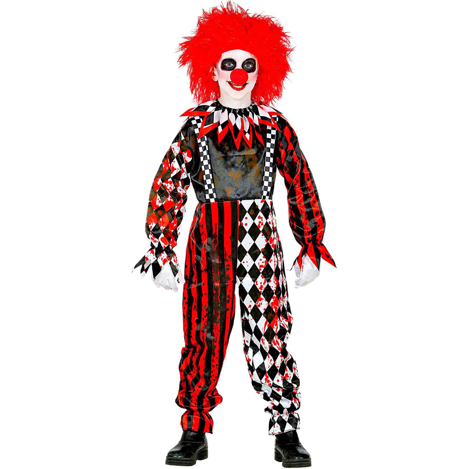 Böser Clown Kinderkostüm Overall blutig mit Rauten und Streifen schwarz-rot – (ARTIKEL/REFERNZ: 8003558525157/WI52515-8003558525164/WI52516-8003558525171/WI52517-8003558525188/WI52518-8003558525195/WI52519 – Kategorie/Suche: Stephen King ES IT Horrorclown Pennywise – Hersteller: Widmann S.r.l.)
