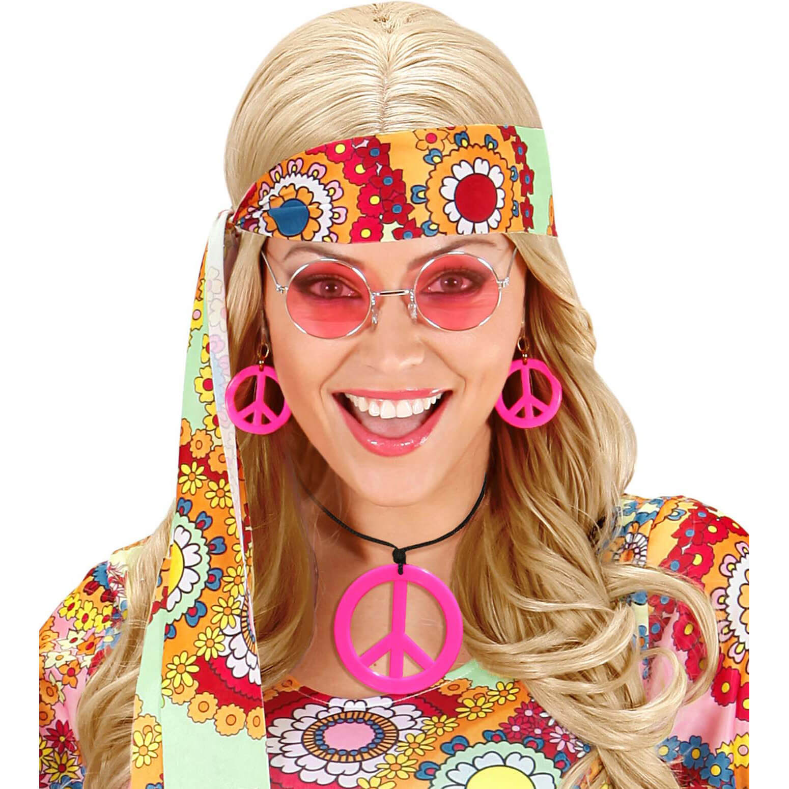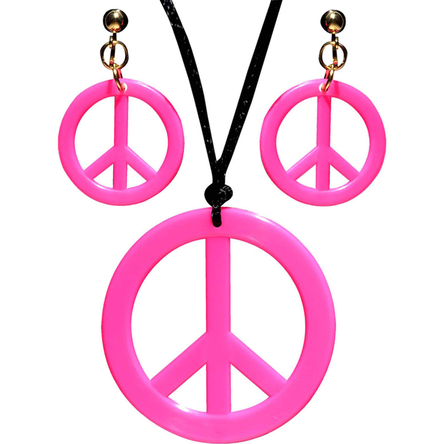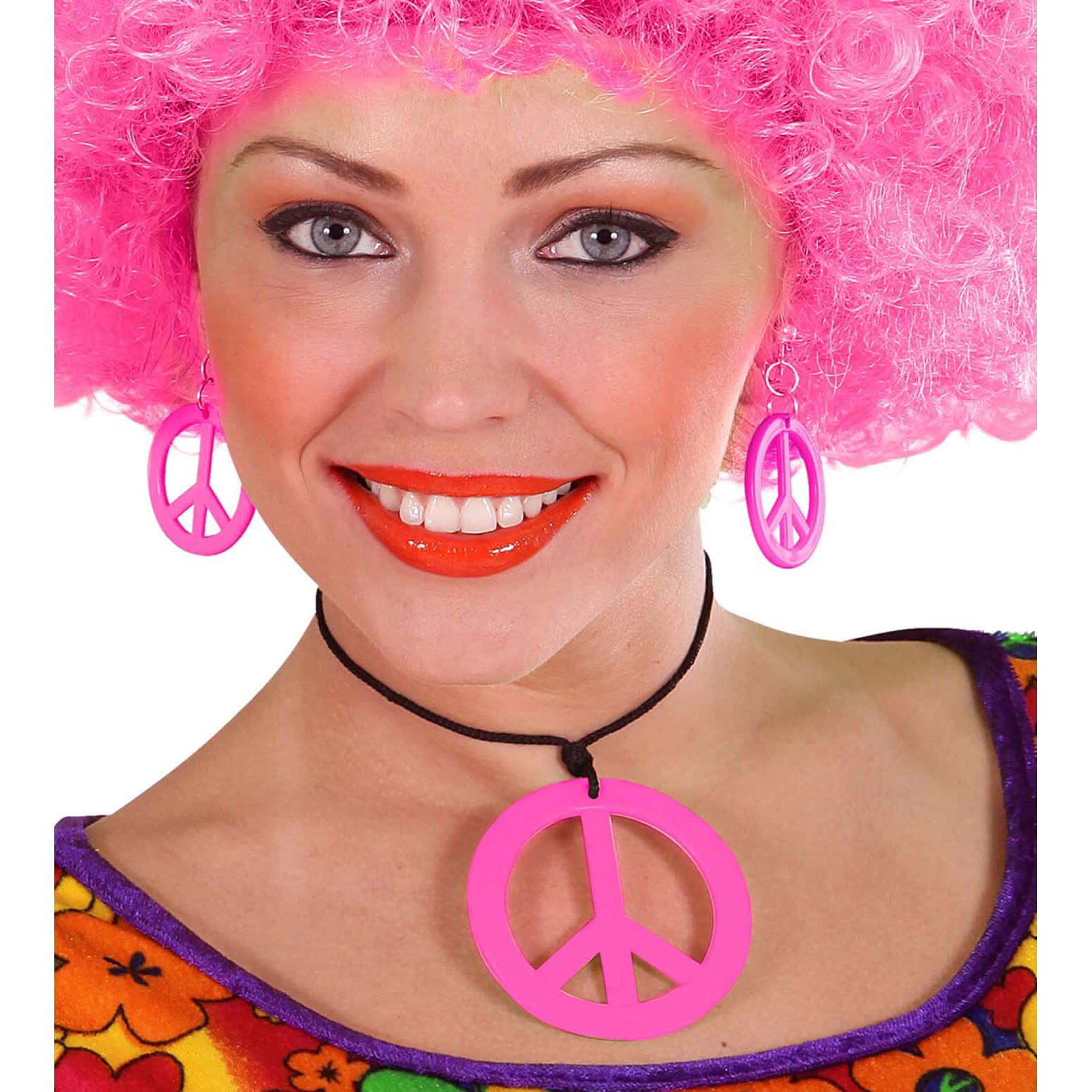 70er Jahre Hippie Peacezeichen Halskette+Ohrring Set aus neonpinkem Kunststoff mit Textilhalsband pink – (ARTIKEL/REFERNZ: 8003558532810/WI53281 – Kategorie/Suche: – Hersteller: Widmann S.r.l.)