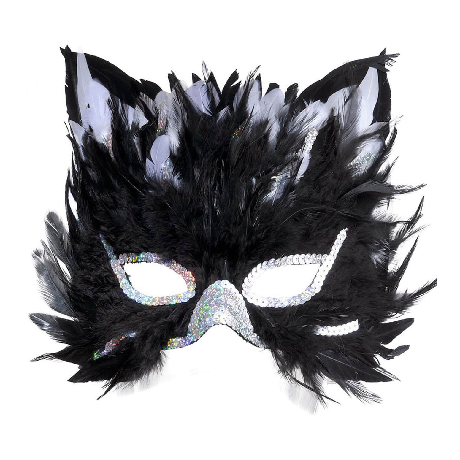 Katze Dominomaske mit Federn und Pailletten schwarz-silber