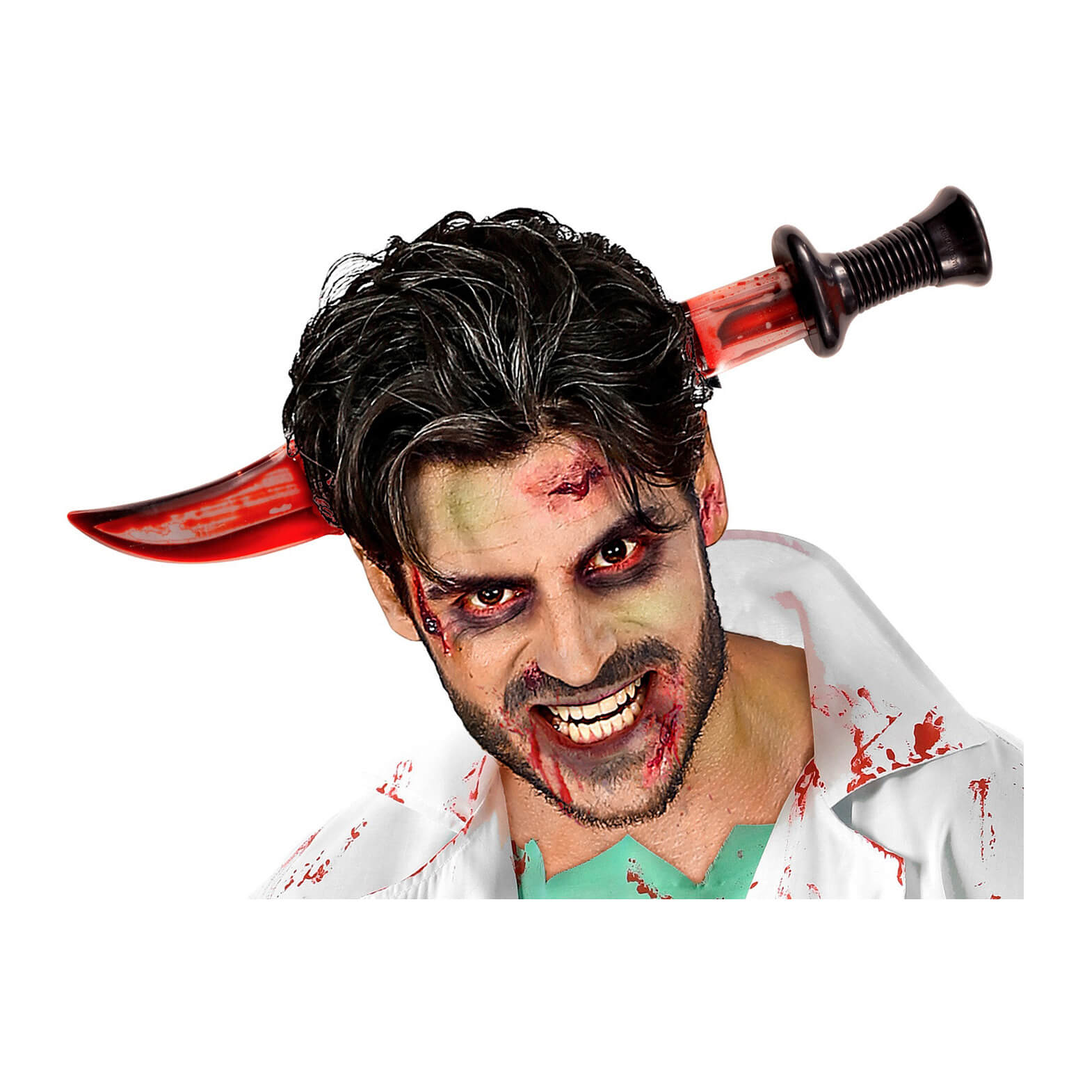 Blutiges Messer durch Kopf Wunde Haarreif rot