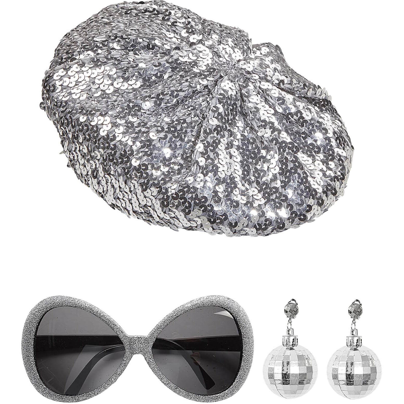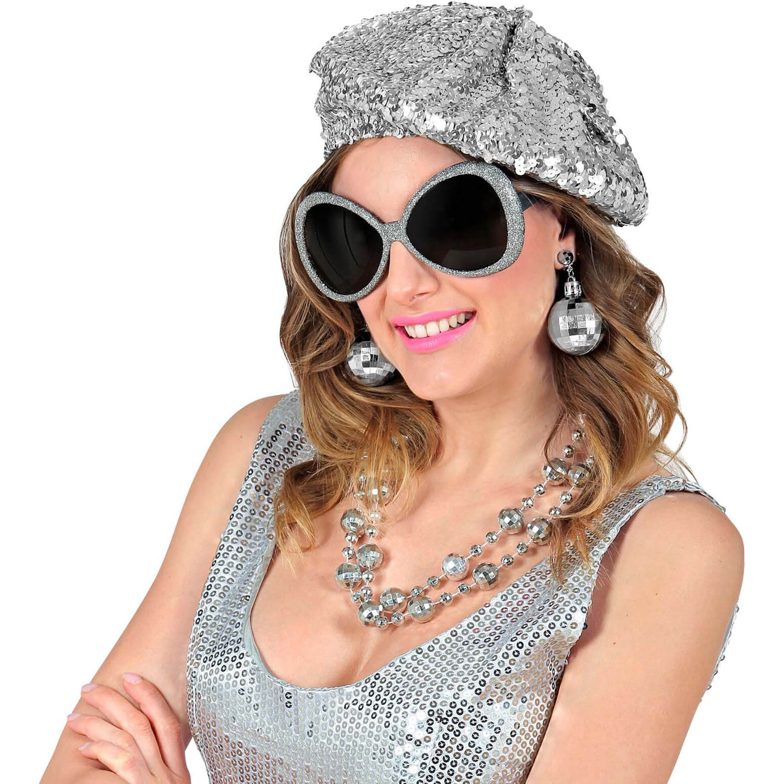 80er Jahre Discokugel Schmuck Set+Brille+Mütze Ohrringe Glitzer Butterflybrille und Pailletten Baskenmütze silber – (ARTIKEL/REFERNZ: 8003558685998/WI68599 – Kategorie/Suche: – Hersteller: Widmann S.r.l.)
