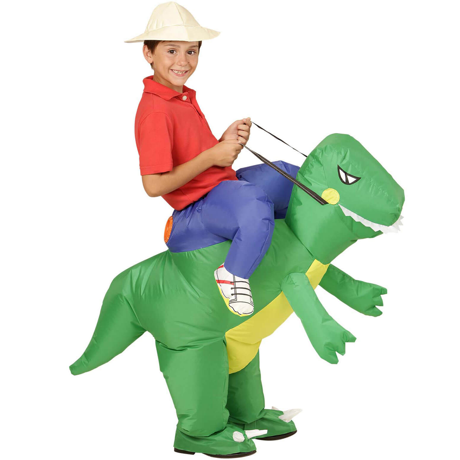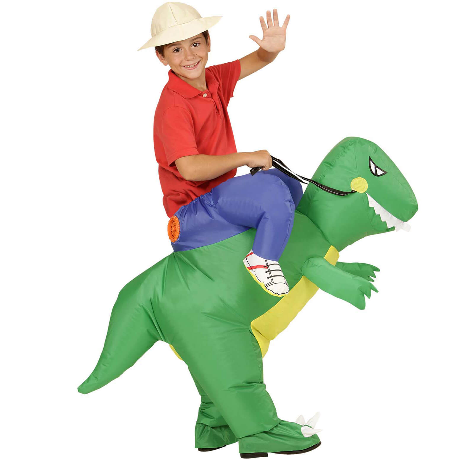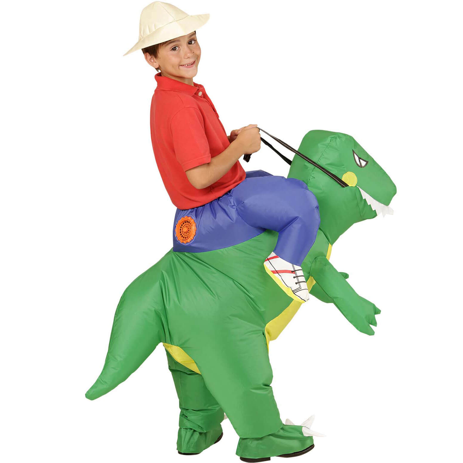 Drache Dinosaurier Kinderkostüm selbstaufblasend Reittier Carry Me Hose mit Ventilator grün-blau