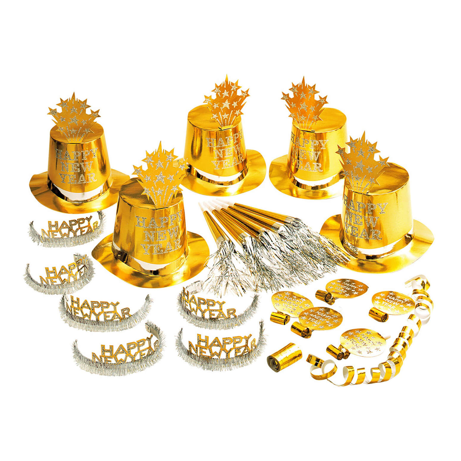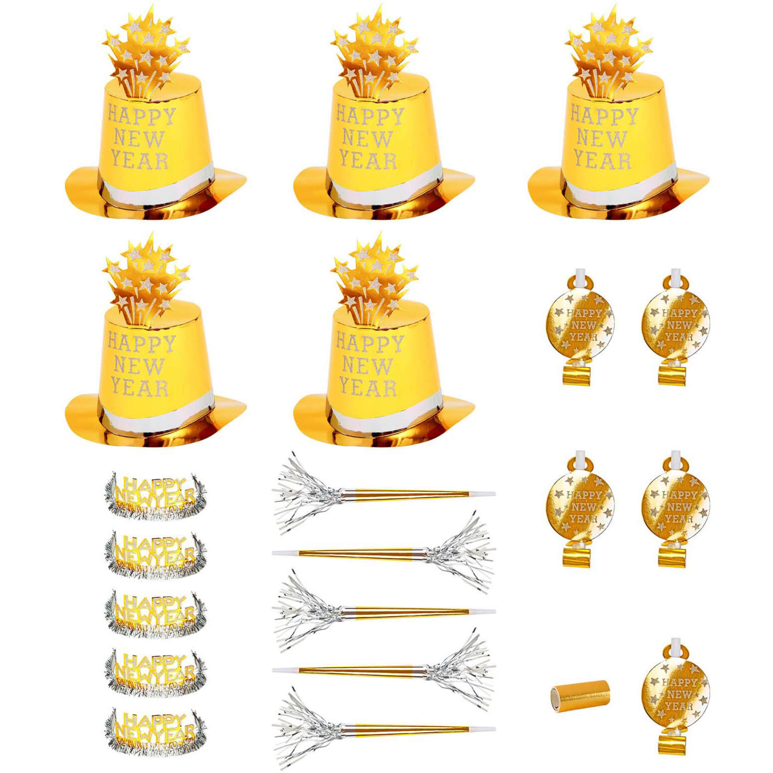Silvester Deko Partyset / Kopfbedeckung / Tröten Happy New Year 5 Zylinder 5 Diademe 5 Tröten 5 Luftrüssel gold