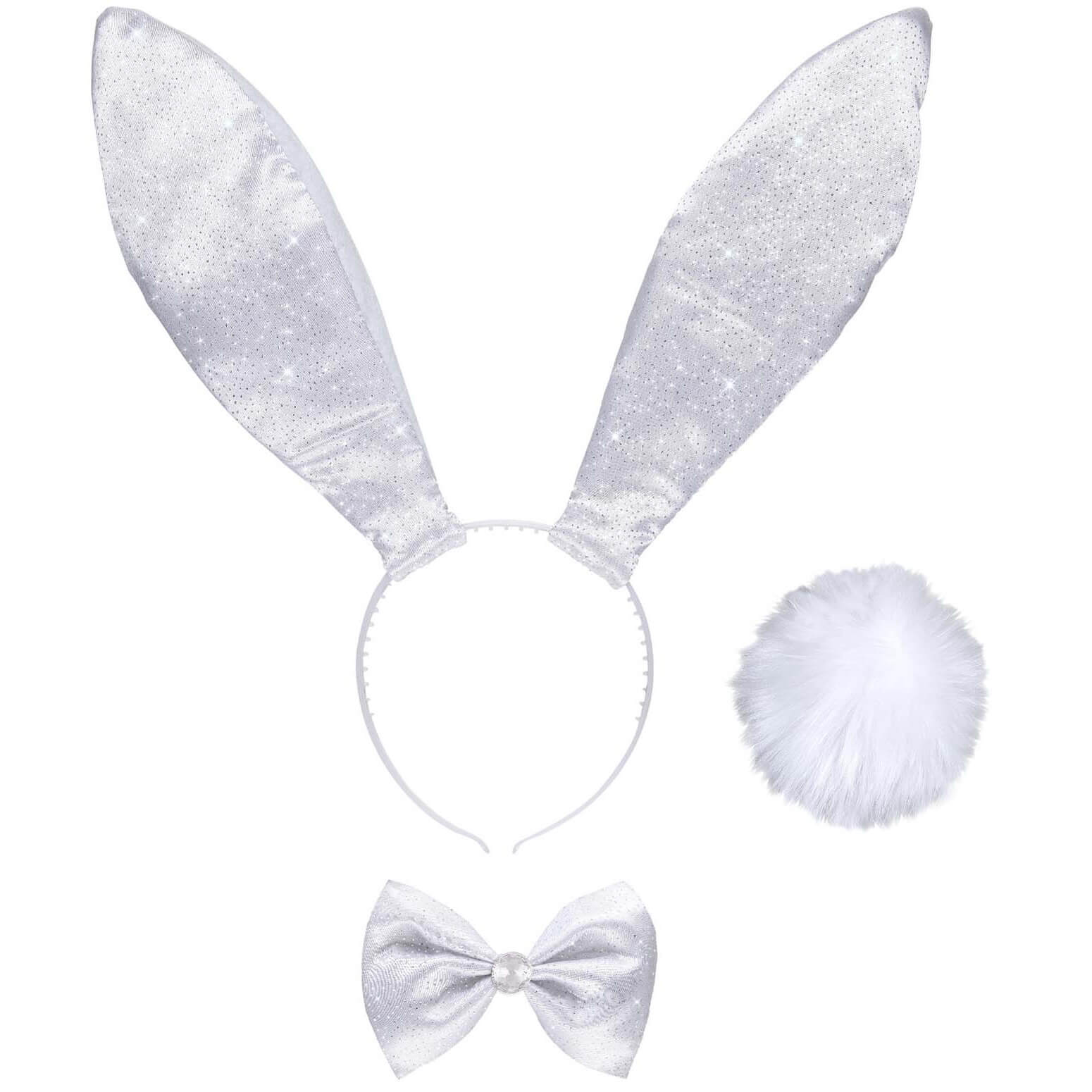 Hasen Haarreif mit Ohren+Fliege+Schwanz Set Glitter weiß