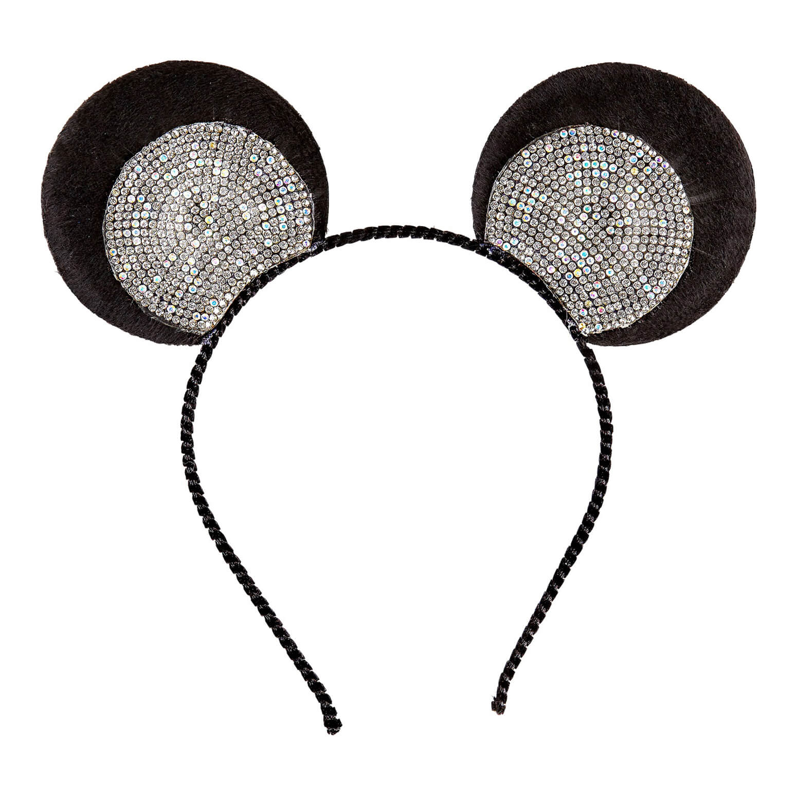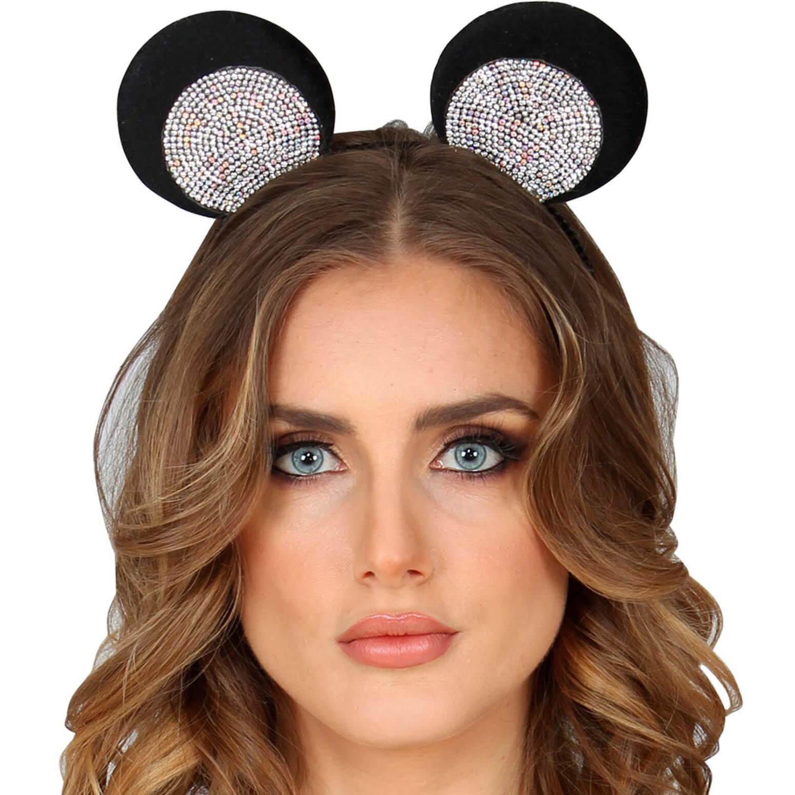 Miss Maus Haarreif mit Ohren mit Strasssteinen Deluxe schwarz-silber