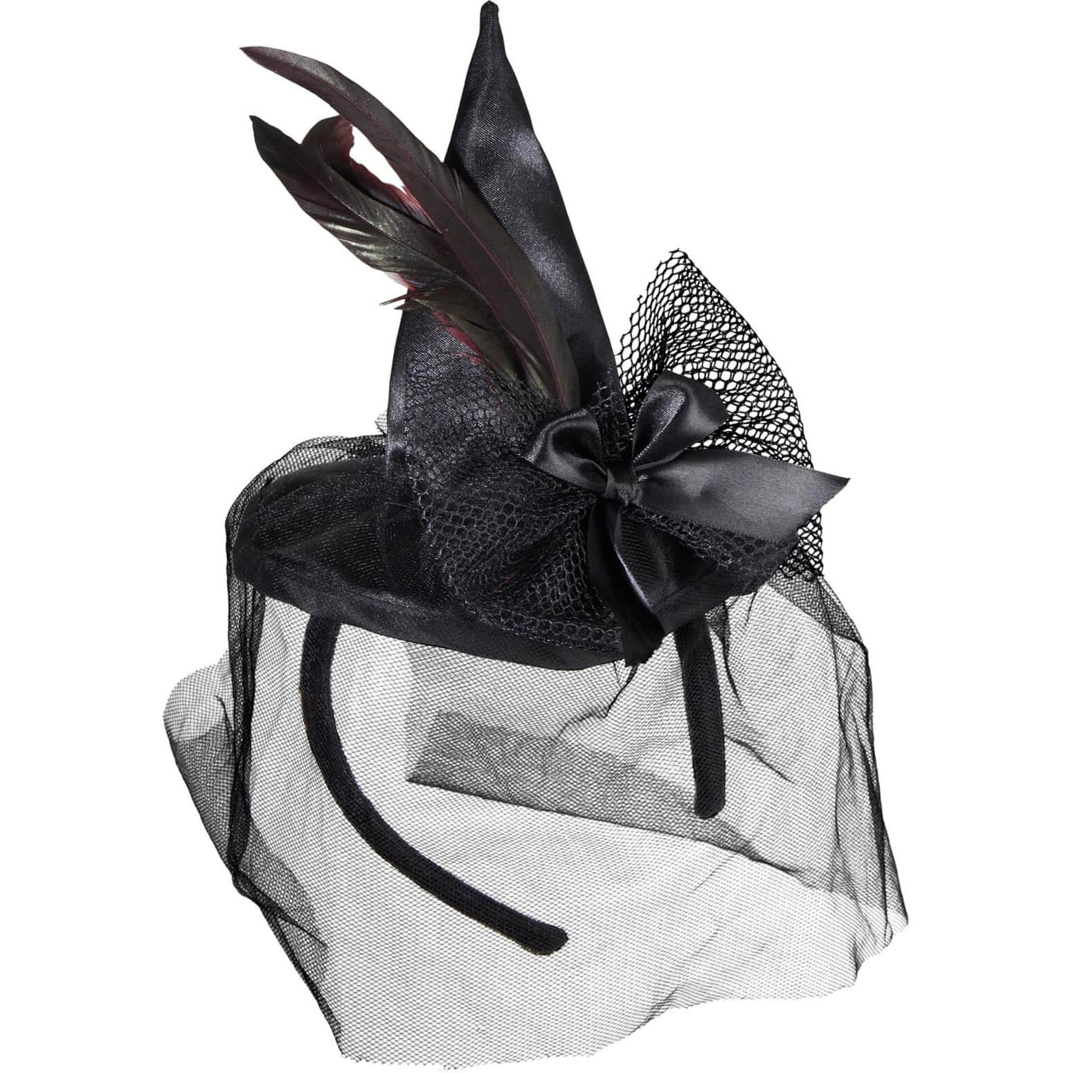 Hexen Zauberer Minihut Hexenhut auf Haarreif aus Stoff Tüllschleier dunkelrot geränderte Federn Schleife schwarz – (ARTIKEL/REFERNZ: 8003558936908/WI9369S – Kategorie/Suche: – Hersteller: Widmann S.r.l.)
