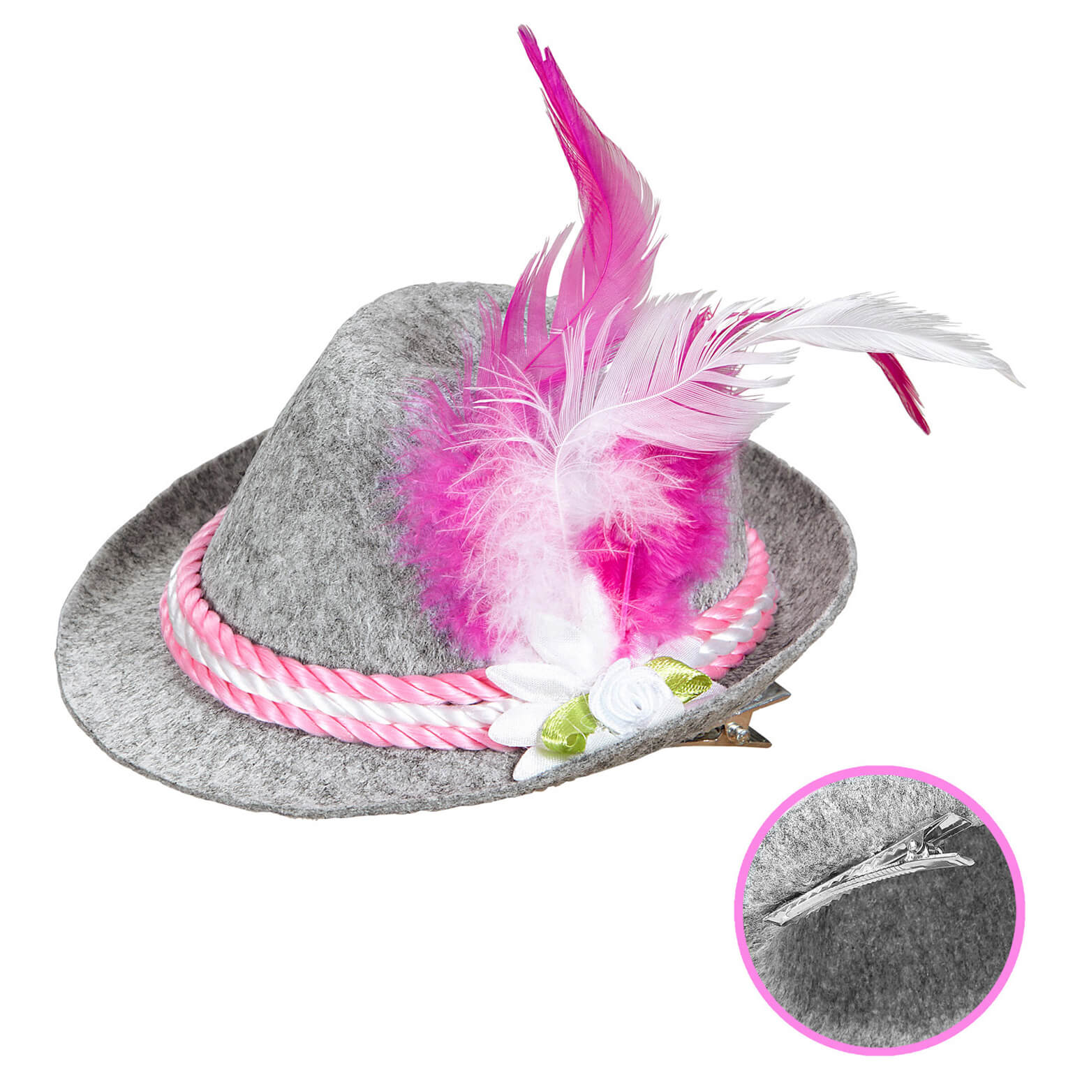 Trachten Minihut mit Haarclip Federn Edelweiß und 3 Zierkordeln grau-pink