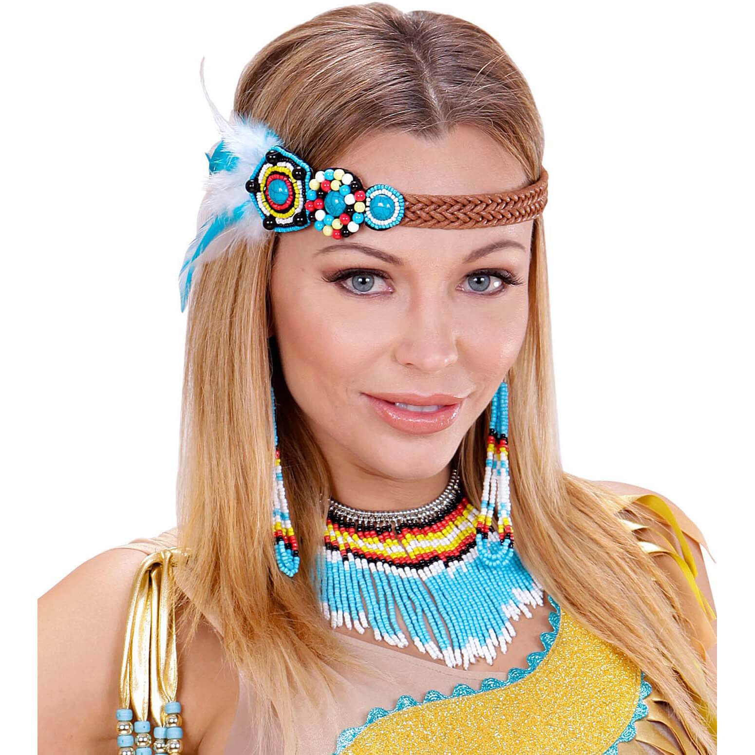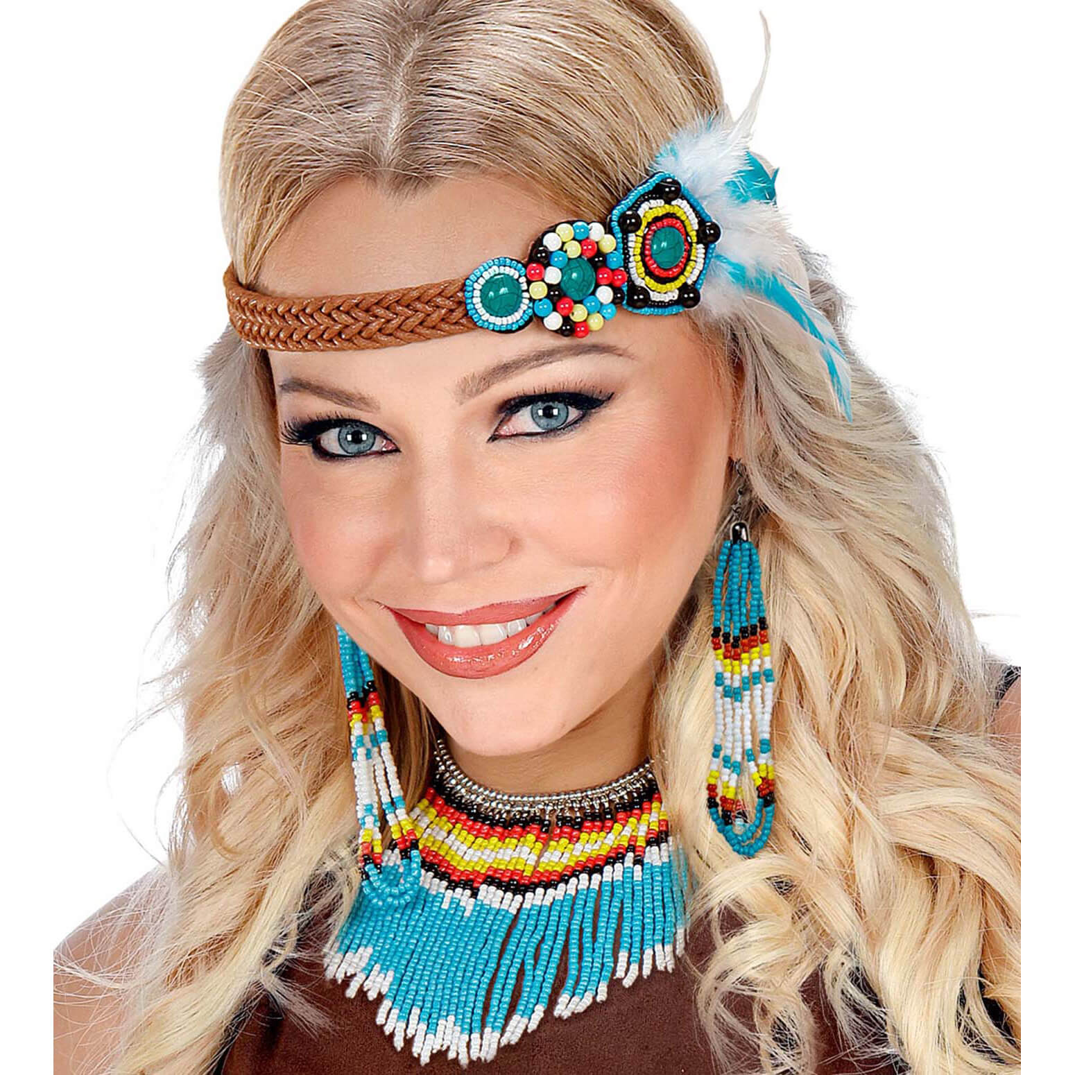 Hippie/Indianer Halskette+Ohrringe+Stirnband Set mit Federn und kleinen Perlen in türkis-braun Lederoptik bunt – (ARTIKEL/REFERNZ: 8003558957200/WI95720 – Kategorie/Suche: – Hersteller: Widmann S.r.l.)