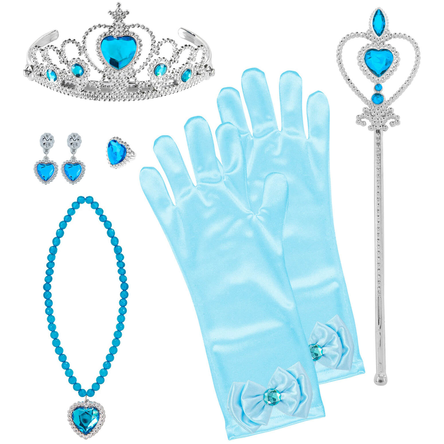 Prinzessin Edeldame Schmuck Set+Handschuhe+Krone+Zepter mit Halsketten+Ohrringen+Ring Diadem silber blau